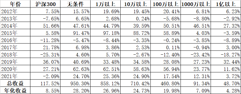 但我当改变成交额阈值,从无条件改变到一个亿的时候,就发现问题了,无条件的时候年化收益率是28.20%,很惊艳,1万以上年化是26.96%、10万以上是24.73%、100万以上是19.98%、1000万以上只有7.09%,低于同期的沪深300了,到了1亿以上,年化收益率只有4.28%。远远低于同期的沪深300了。