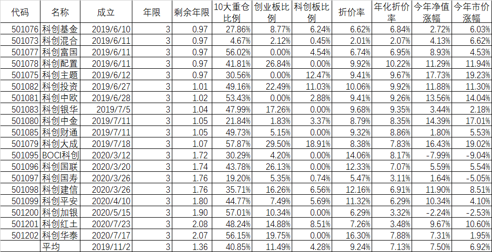 从2019年6月10日到2020年7月17日这1年多里面,鹏华、华安、富国等19家基金公司推出了以科创为主题的封闭3年的封闭基金,这些封基平均还有1.36年(以下所有数据均截止到2021年6月22日)到期,到期后转成普通的开放基金,目前平均折价率9.24%,年化折价率7.13%,今年平均净值涨幅为7.50%,平均市价涨幅为6.92%,半年多来折价率还有所扩大。但我们仔细看10大重仓的比例,平均为40.85%,而科创板的比例平均只有4.28%,其中7只基金在10大重仓中没有一只科创板,反而是创业板的平均比例11.49%还比科创板要高很多。不过今年除了BOCI科创和科创加银亏损外,其他17只基金都还是正收益,净值涨幅最大的科创大成今年涨了16.43%,恰恰是科创板比例最高的一只科创板封基。