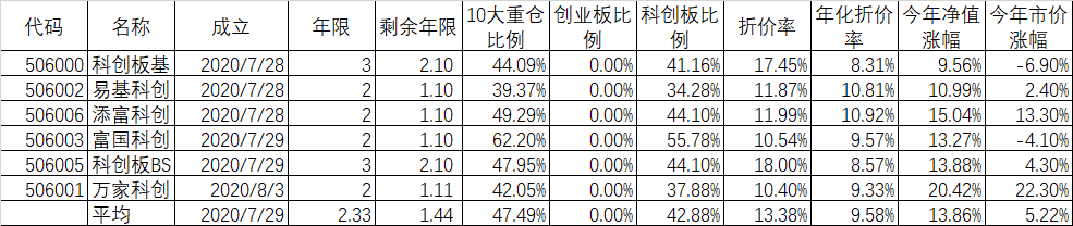 这种名不副实的情况从去年7月份开始得到改善,去年7月28日开始,南方、易方达、汇添富、富国、博时、万家等6家公司成立的科创封基,做了2个改进:第一10大持仓全部是科创板股票,第二到期后不是转成永久的开放基金,而是变成了定开基金,也就是说到期开放若干天后再次封闭2-3年,循环往复以至无穷。目前平均折价率13.38%、年化折价率9.58%,今年净值平均涨幅为13.86%,最低9.56%,最高20.42%,年化折价率比前面第一批的科创基金高,而且纯粹都是科创板股票,今年的表现也好,而且相当于每年在打九折卖科创板,如果看好科创板,小散又由于不到50万资产无法开通权限的,打九折买科创板对小散是一个机会。