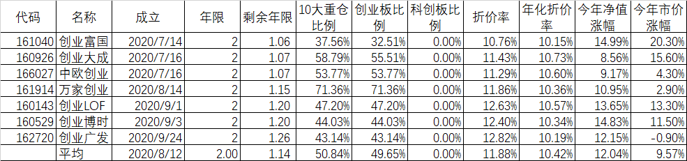 去年7月份开始,富国、大成、中欧、万家、南方、博时、广发等7家基金公司又发现了封闭期为2年的创业板定开基金,我查了一下,10大重仓几乎全部都是创业板,目前还有1年多一点到期,平均折价率11.88%,平均年化折价率10.42%,今年净值涨幅平均12.04%,最低的创业大成涨了8.56%,最高的创业博时涨了14.83%。和前面的科创封基一样,都是今年上市交易的,所以今年的市价我都是按照1开始算起的,仅供参考。这批创业板封基和前面的科创板封基,分别几乎全仓了创业板和科创板,而且年化折价率都在10%左右。成交量也相对比较大,是我们替代双创基金的好品种。
