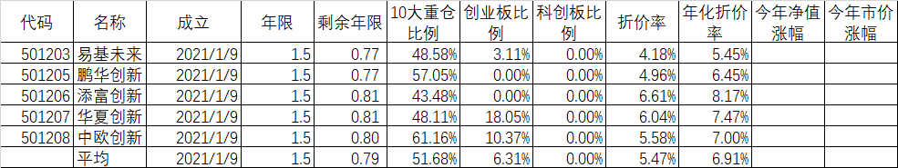今年易方达、鹏华、汇添富、华夏、中欧等5家公司在1月9日成立了以创新为主题,封闭18个月的封基,不过看了一下10大重仓,创业板比例平均只有6.31%、科创板在10大重仓里一个都没有,折价率为5.47%,年化折价率也只有6.91%。和以上两个纯科创和纯创业板的封基相比,似乎没什么优势。