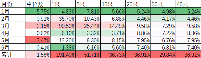 把10个因子的排名加权相加,再调整每个因子的权重,最终留下了价格(权重4)、转股溢价率(权重2)余额/股本(权重1)、股票市值(权重1)、弹性(权重-1),分别取前1只、前5只、前10只、前20只、前30只、前40只得到上述结果,除了1月份可转债暴跌无法避免外,其他绝大部分月份都获得了不错的正收益。除了6月份只选第一名的文科转债跌了1.38%外。