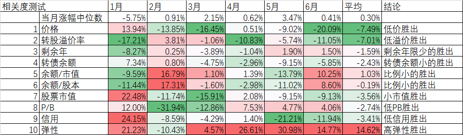 第一步我们先用今年6个月的数据(截止到6月24日)的可转债涨幅中位数和因子的数据做了相关性回测,其中信用等级我设定AAA为8、AA+为7、AA为6、AA-为5、A+为4、A为3、BB为2、B为1。其他9个因子不做数字化处理,结果如下: