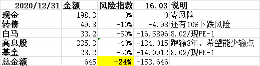新的一年不敢期望过高。指数已连涨两年,全市场指数虽仍不算高,但结构化高估已非常明显。也许它们还能在天上继续飞,但,万一,摔下来呢?担心殃及池鱼。目前医药基金已清仓,手头现金高达31%。下半年逐步买入了地惨+银行,使红利股占比高达51%,今后只能调仓而不能加仓了。红利股策略我会继续坚持下去。这三年来给家中领导汇报时总是用“一个策略能持久有效,就是因为它有时会无效”来为自己辩解和打气。盘点了手中持仓,在最极端情况下(沪深300最低PE/当前PE=8.02/16.03=50%),风险指数为24%,大体能接受。未谋胜,先谋败,性格就决定了我就是苦命的恐高人。