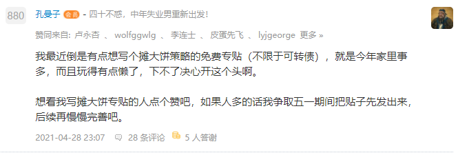 最后预告一下,过两天我准备开始写一个摊大饼策略的长贴(已经有880人点赞了,不写不行了啊)。同时我也准备从下个月起知行合一,把主要精力放在摊大饼策略的打磨上,没有硬逻辑和底价的A股品种可能就不设中重仓了。