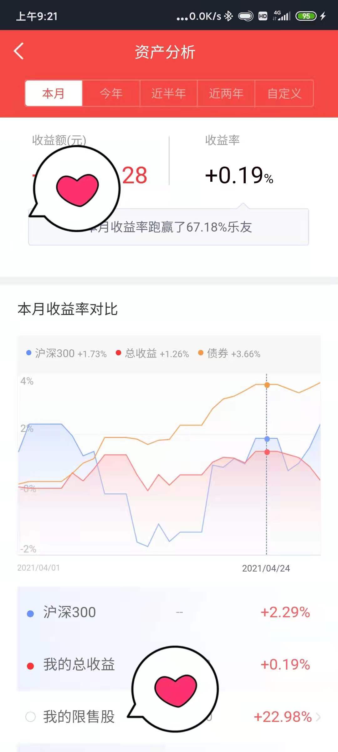本月收盘净值为1.088比上月上升0.014,风险系数0.14。1月至4月净值分别为0.995、1.048、1.074和1.088,保持住了上升的势头。保留了一成半的现金,并且还掉了买要约股和南极电商等的融资,将大部分转债都转回了普通账户。显然目前市场并非牛市,还是小心一点吧。