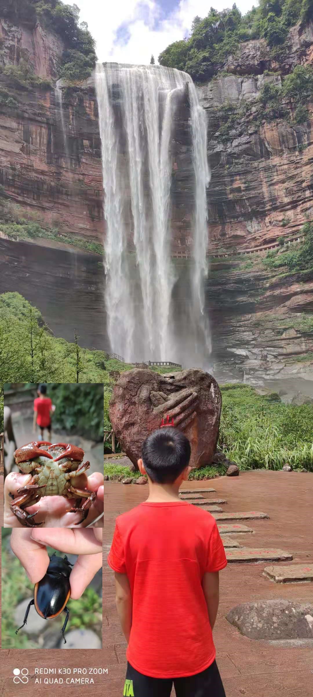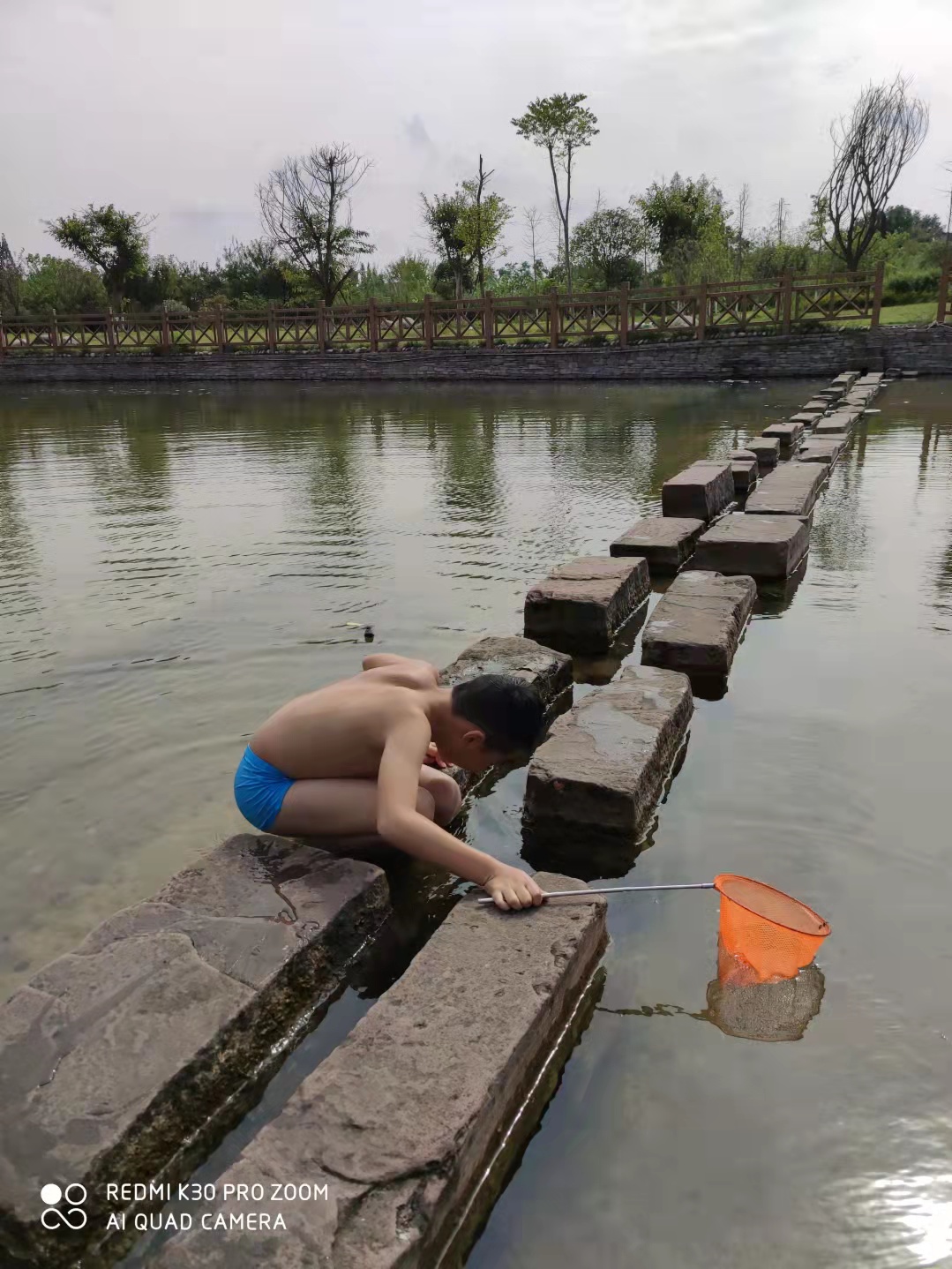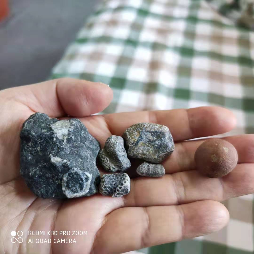 儿子在小溪边挖挖拣拣,不一会儿就找到了好几块珊瑚类的小化石,很是激动,孩子的快乐就是如此简单啊。曾见识过巨型化石的我也随手挖着玩玩,但却一无所获。还好,后来我也发现了一枚陶制的弹丸,也许这就是宋灭沙陀古战场留下的一件小小证物吧。