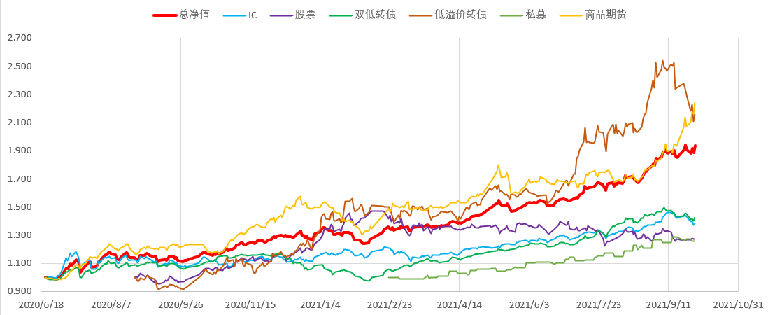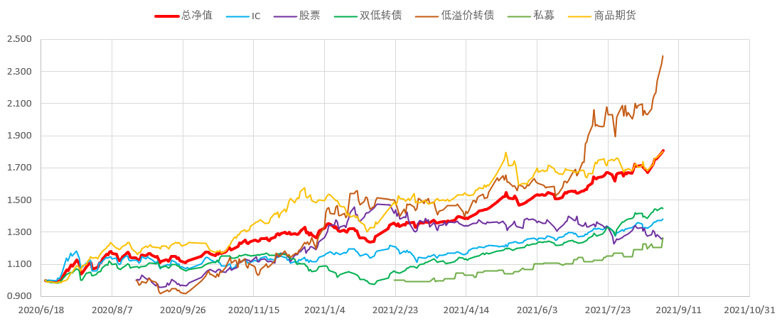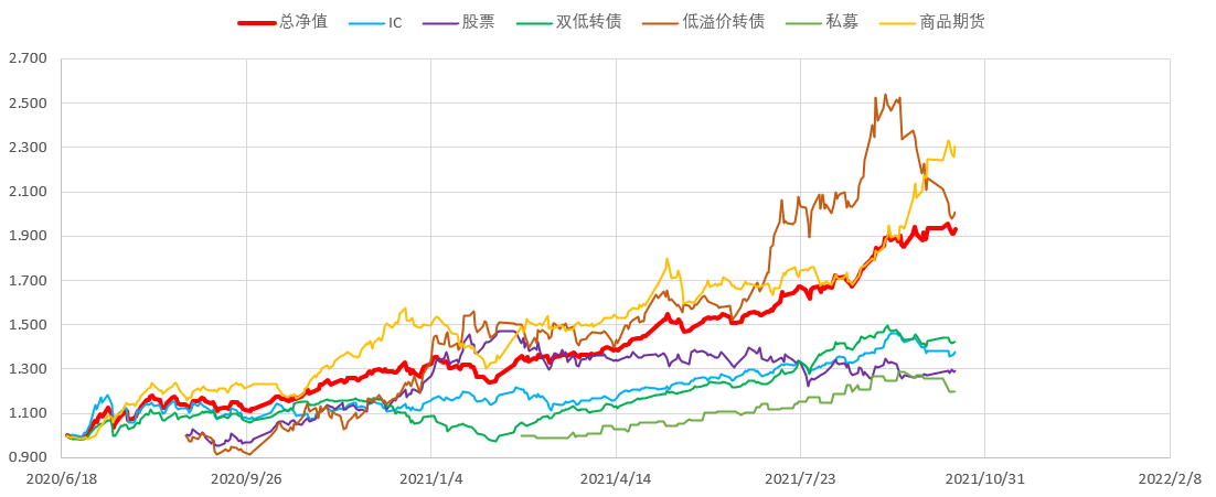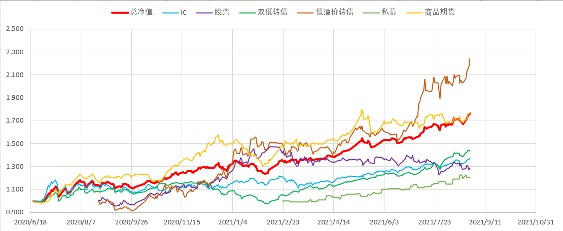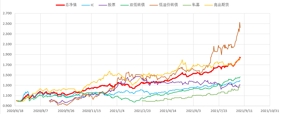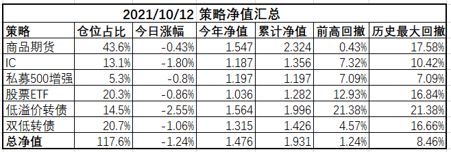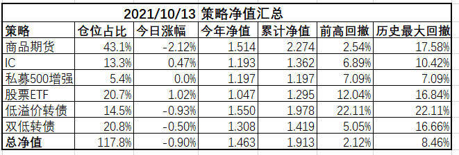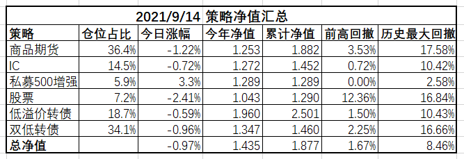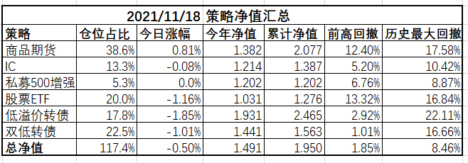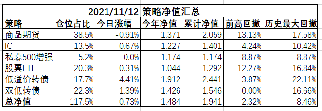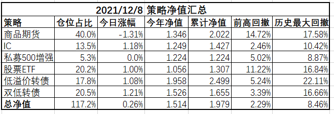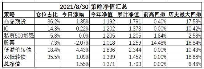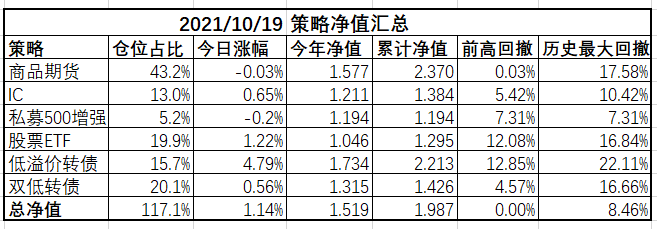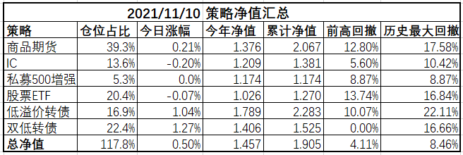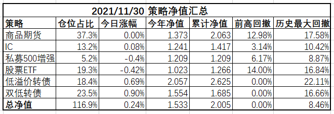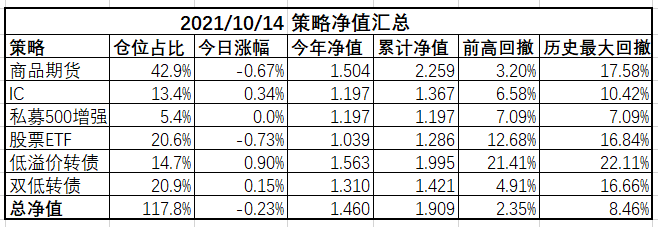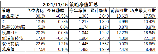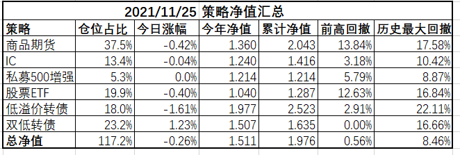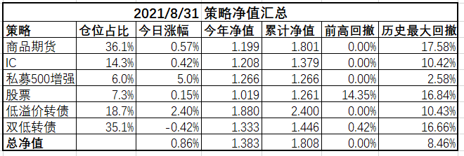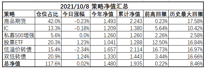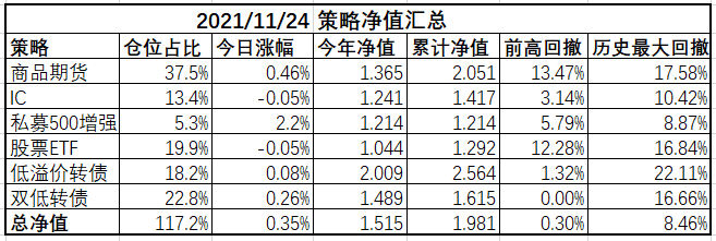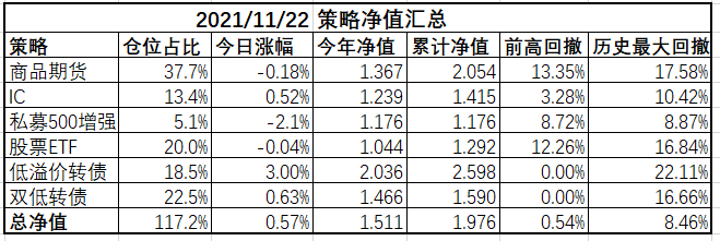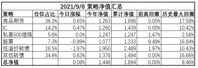 +0.08%,新高。今天低溢价转债吃了大面,双低、IC、商品继续小幅新高,总净值勉强收出新高。