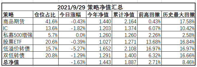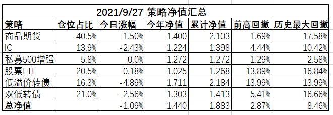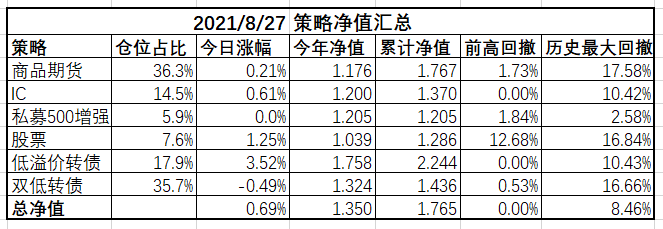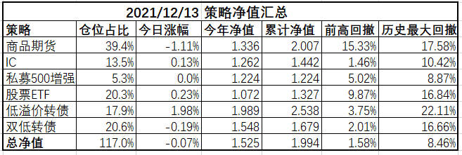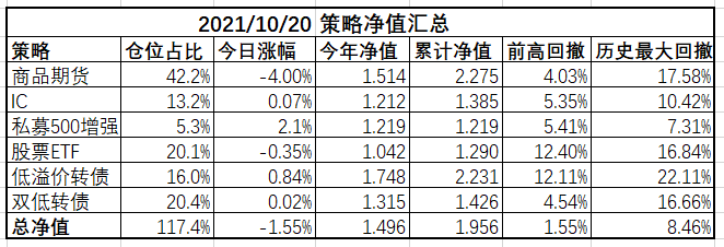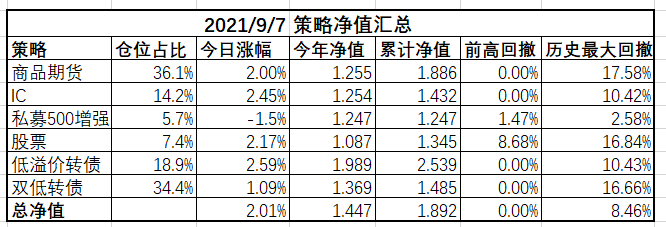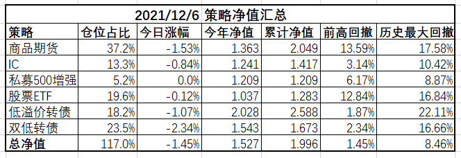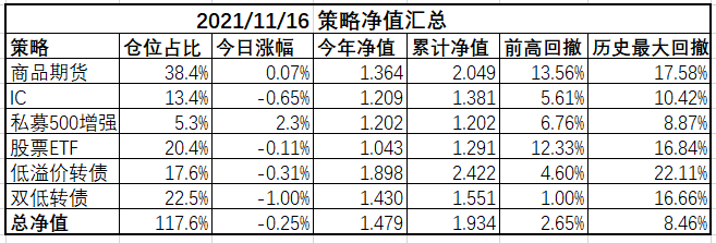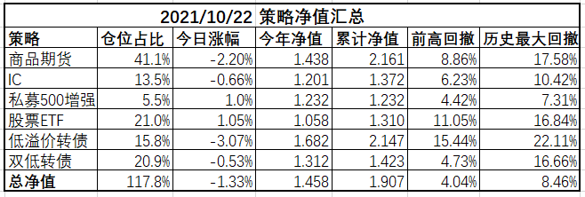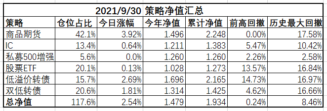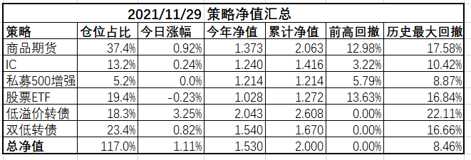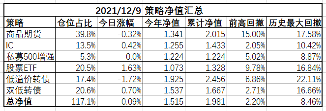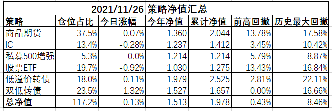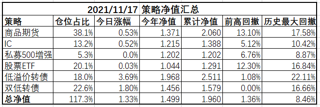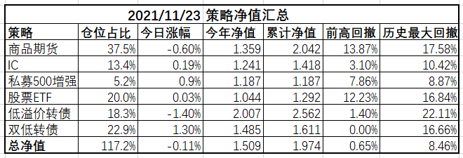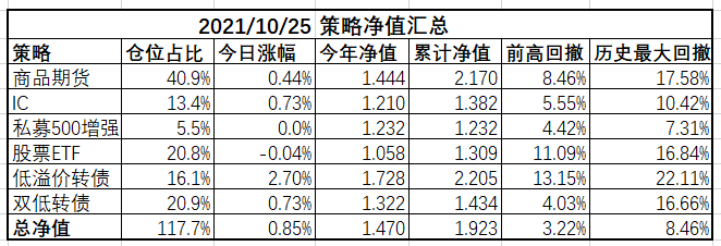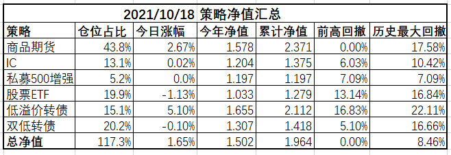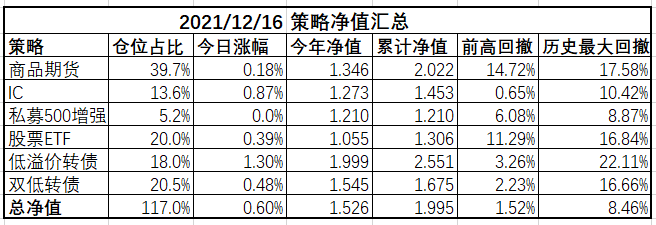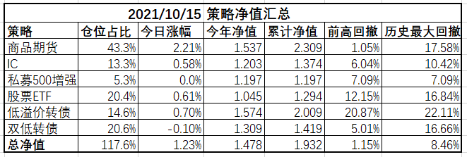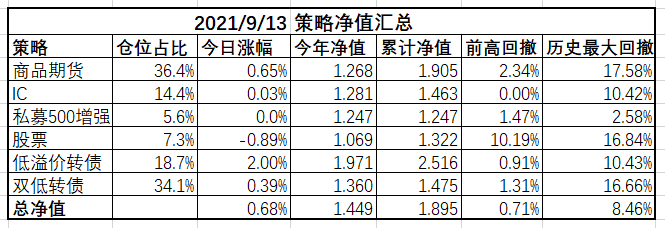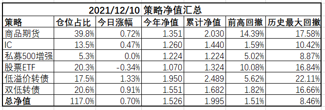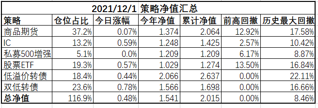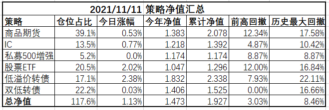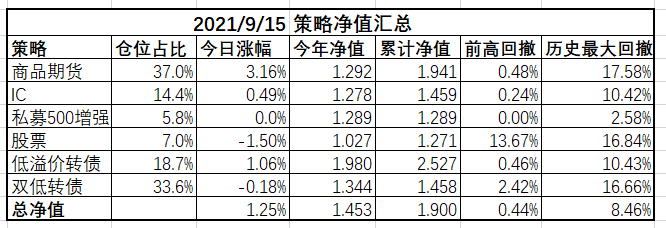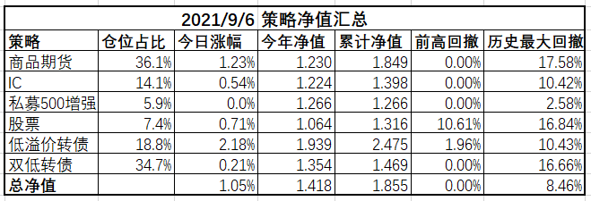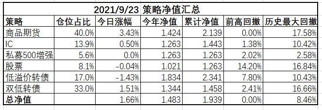 +0.65%,新高。本周五连涨,周收益5.5%,完美收官。今天低溢价及IC策略再创新高,双低转债回撤,商品走了个大V最后微盈。