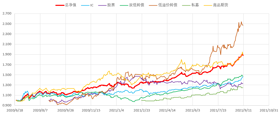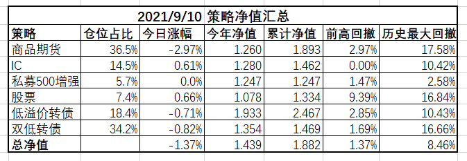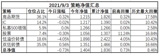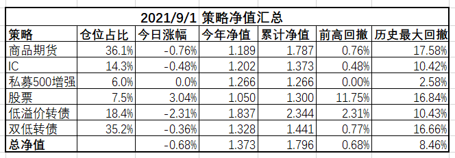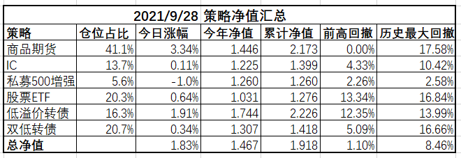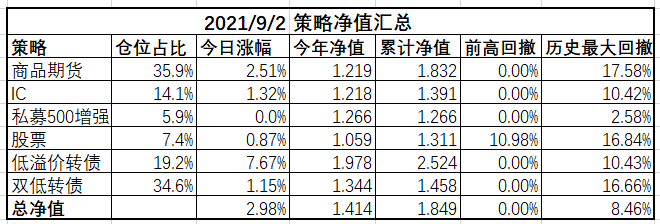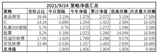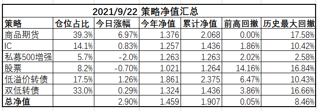 +2.9%,大口回血。今天商品送来中秋大礼,黑色系再次上演疯狂,商品策略收获近7%,创出新高。除股票仓位外,其他策略都还不错。总净值距前高只差临门一脚了。
