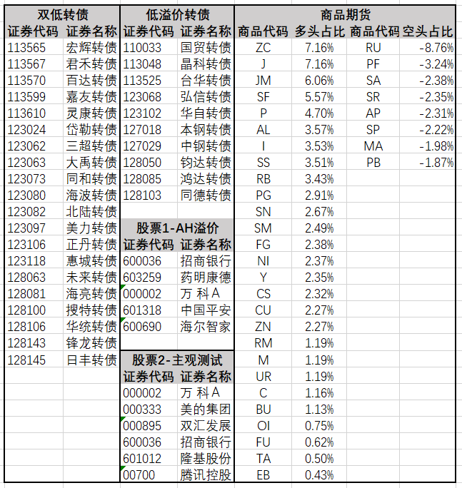 +1.05%,新高。今天全线上涨,大盘强于小盘。双低转债微盈继续新高,低溢价虽涨的不错但只收回周五跌幅的一半;IC继续小步新高;商品方面煤炭系继续暴涨,创出新高。