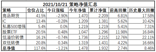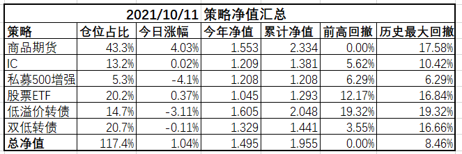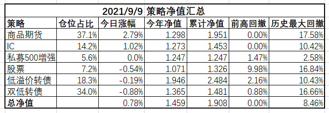 +0.78%,新高。今天两个转债策略都亏损;在煤炭疯牛的带领下,IC与商品策略继续新高。
