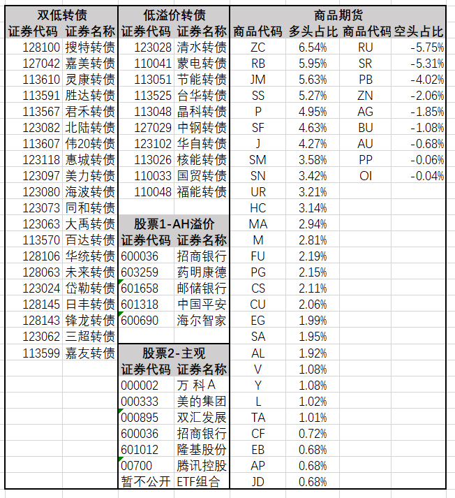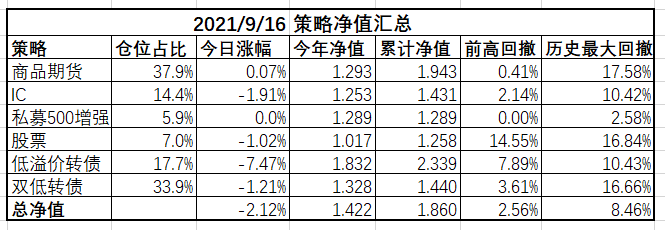 +2.01%,新高。今天继续全线上涨,双低转债、低溢价转债、IC、商品均创出新高;私募更新上周净值,大幅负超额。