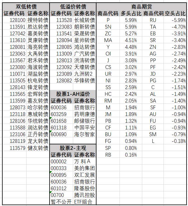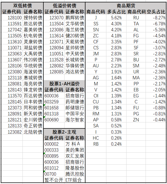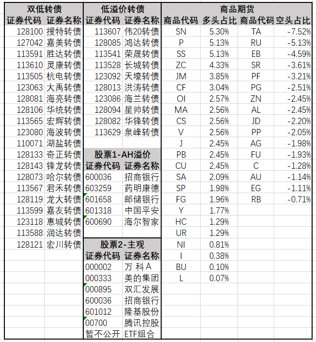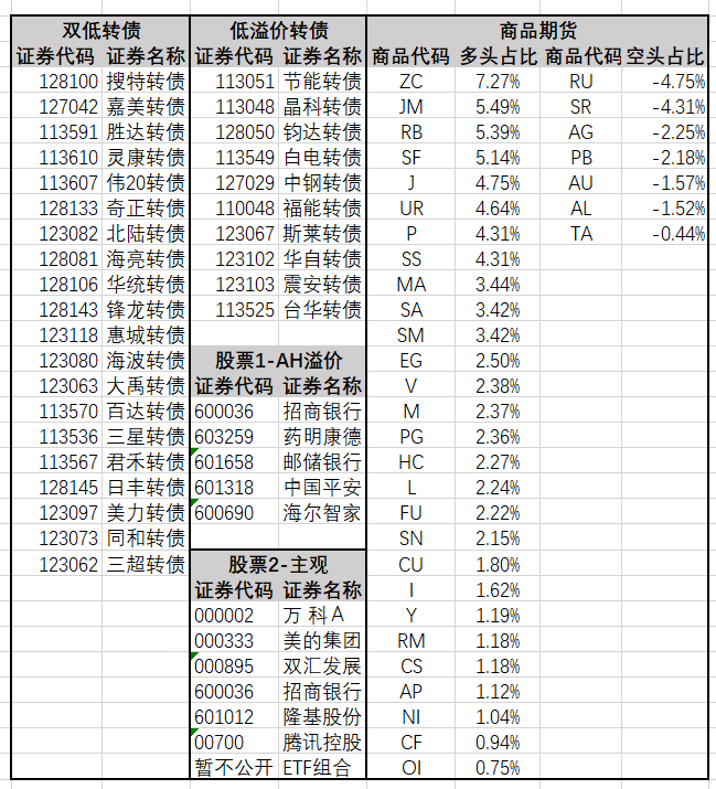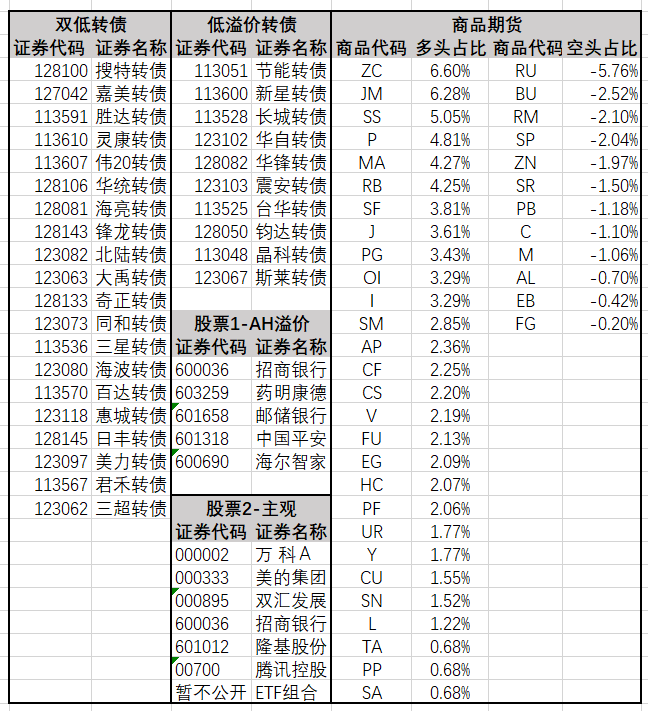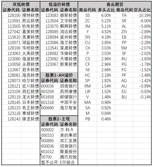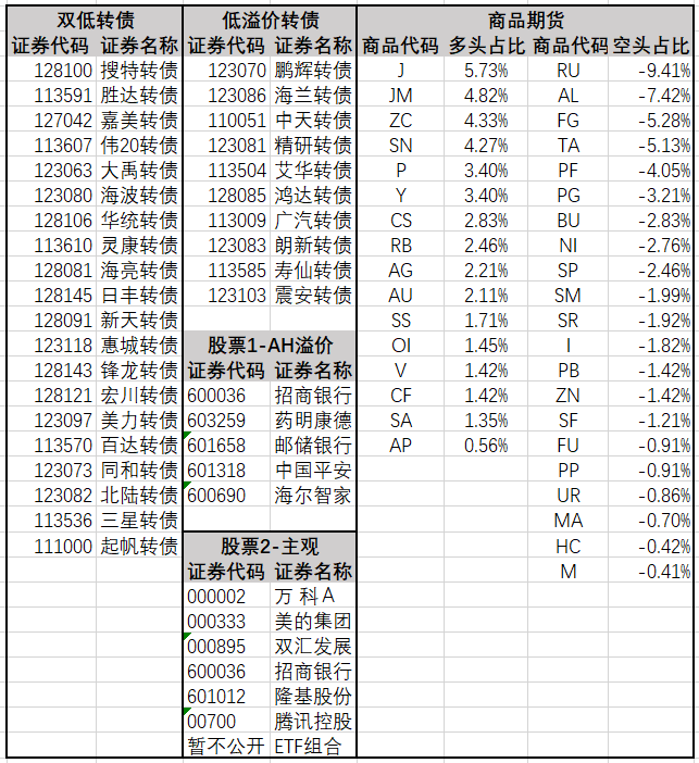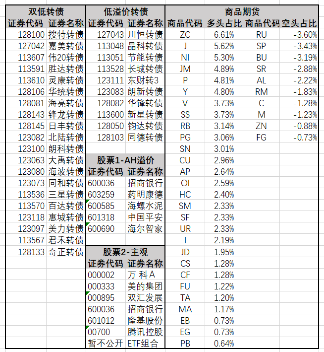 权益仓位:占比45%。其中20%的仓位吃IC贴水。12.5%的仓位做低溢价转债轮动。12.5%的仓位做股票,目前主要思路是AH溢价。