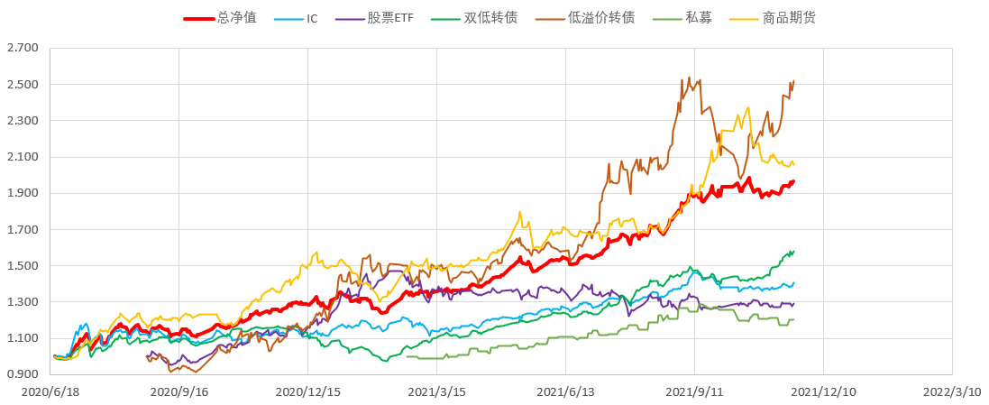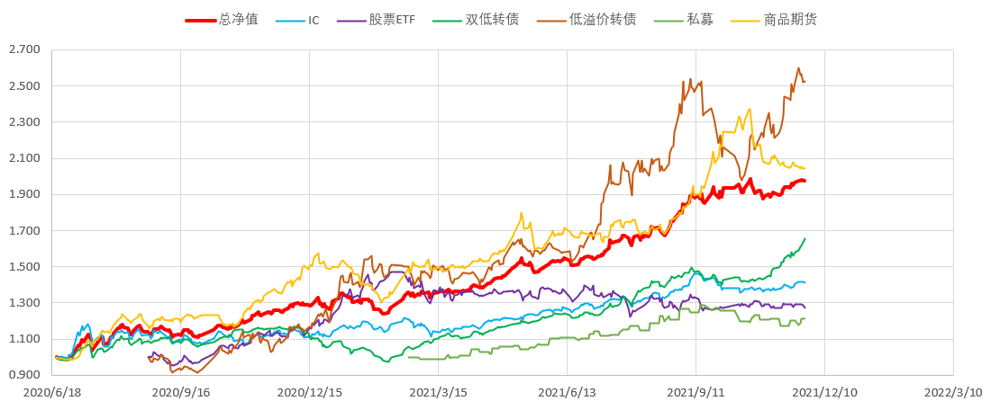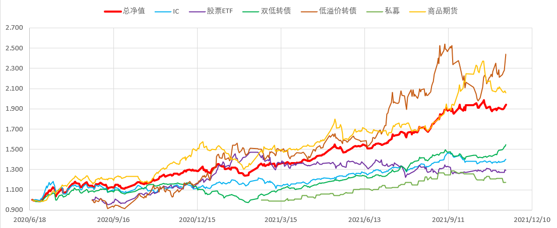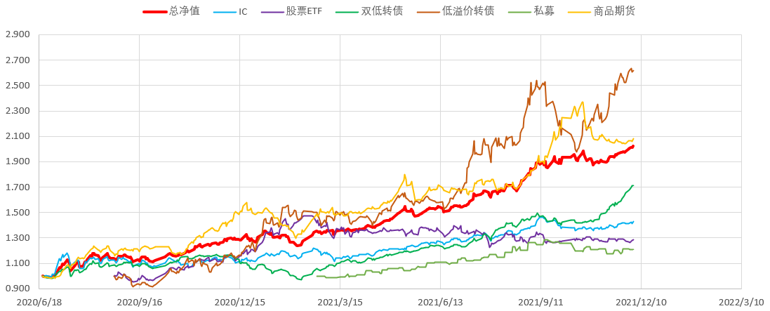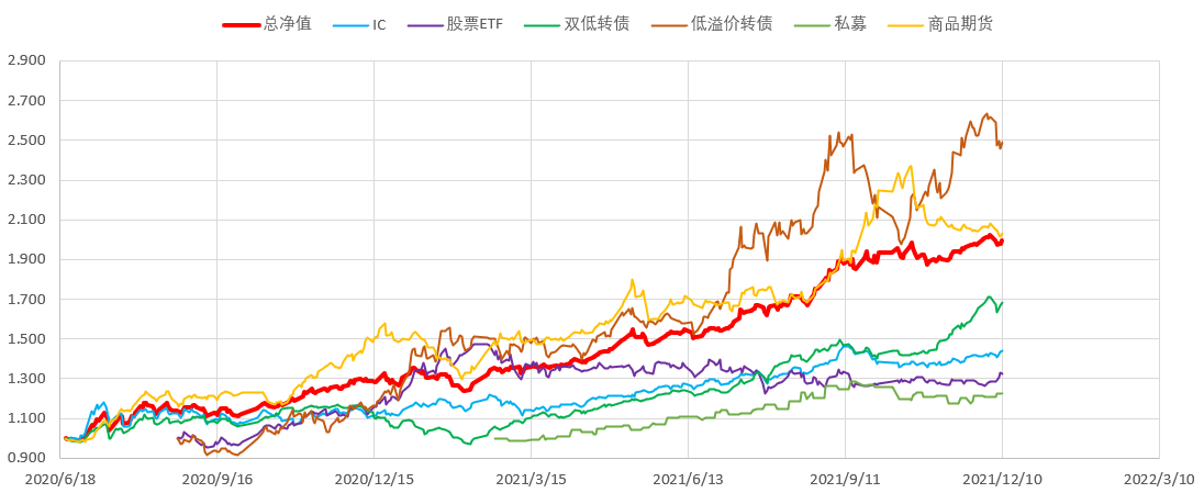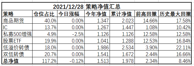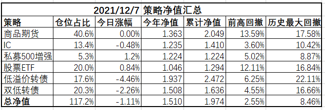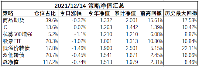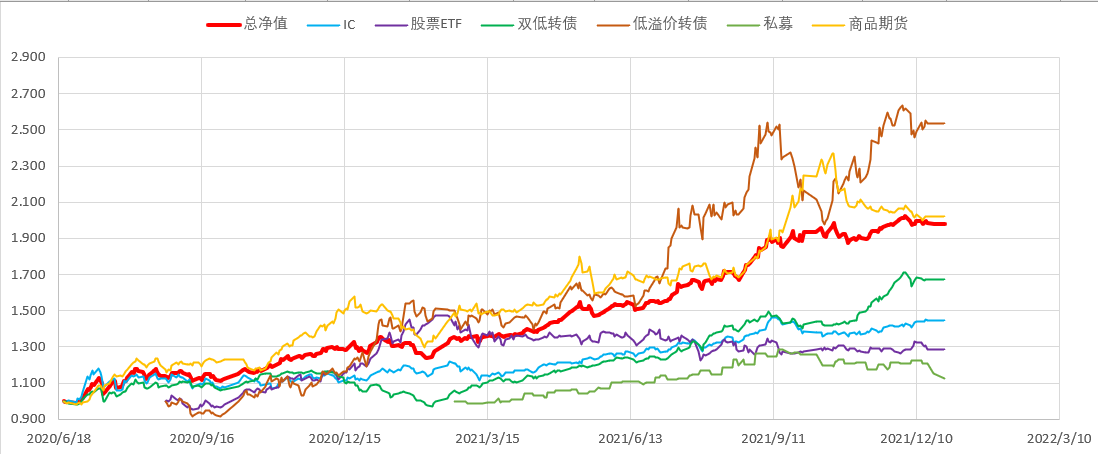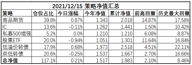 2021年总体实现51.3%的收益,期间最大回撤8.46%,当前距前高2.34%,出坑压力不大。分策略来看,低溢价转债表现最为抢眼,年内收益98.6%,接近翻倍;双低转债也表现出色,做为低波动策略获得了54%的收益,算是超常表现了;商品策略虽然较2020年表现差一点,但在行情跌宕起伏的今年收获34.7%的收益也还算满意;IC策略收获26.7%,中规中矩;私募拉跨,最后两周回吐了全部超额,截止目前仅录得12.6%;最差的是股票仓位,4.1%的收益勉强跑赢银行理财。