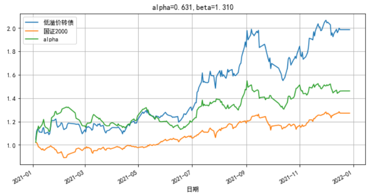 以国证2000为基准,将低溢价转债收益分解为alpha和beta两部分。