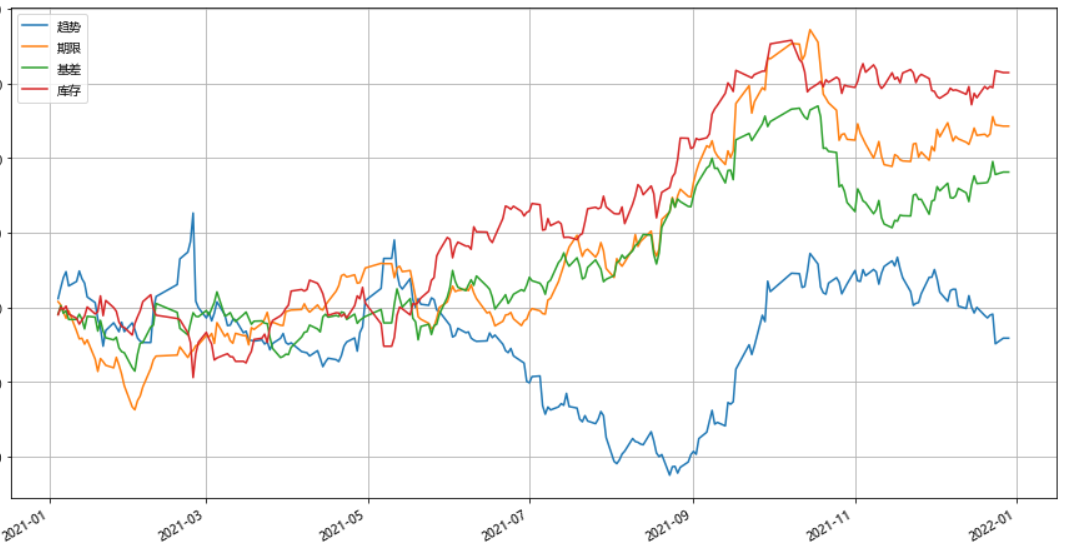 在去年的总结里也提过,我的商品策略主要配置了趋势、期限、基差、库存四个因子,今年各因子的走势回测如下: