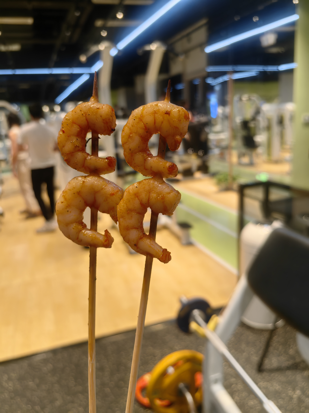 今天继续健身,陌生的朋友送了5串烤基围虾,味道还不错哟。