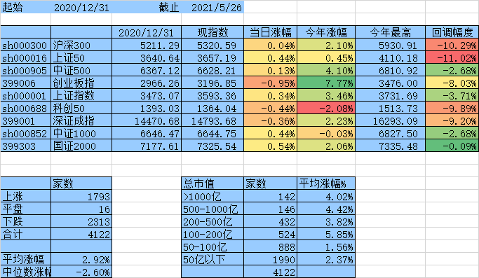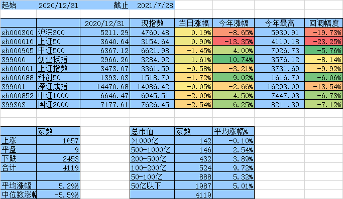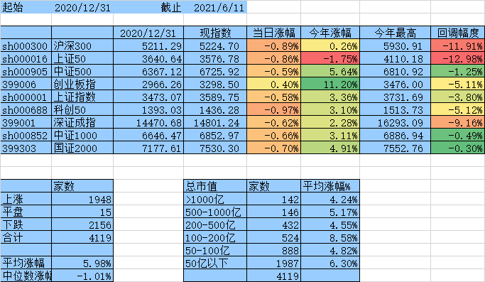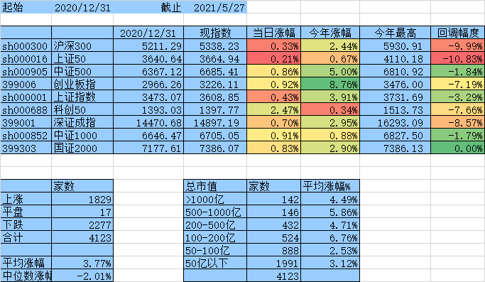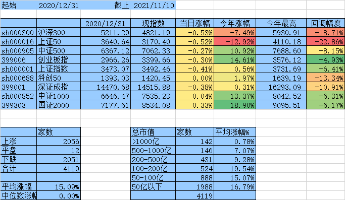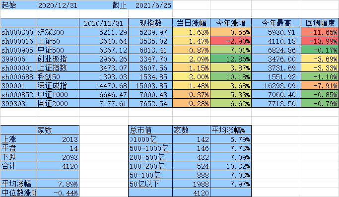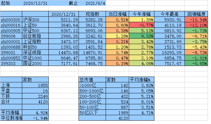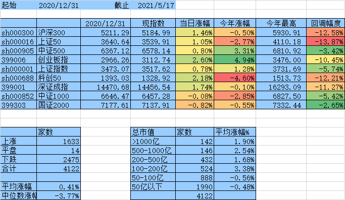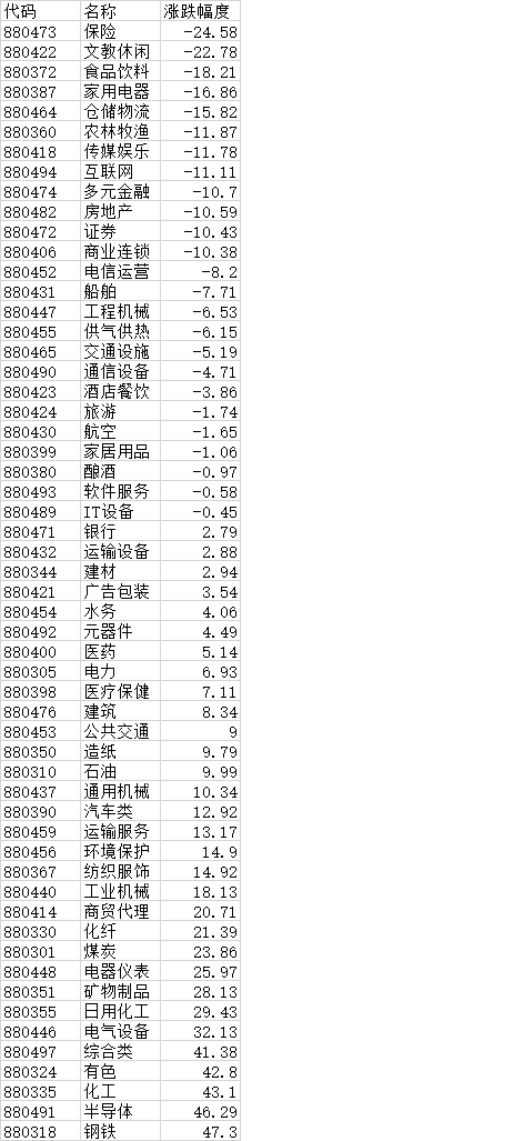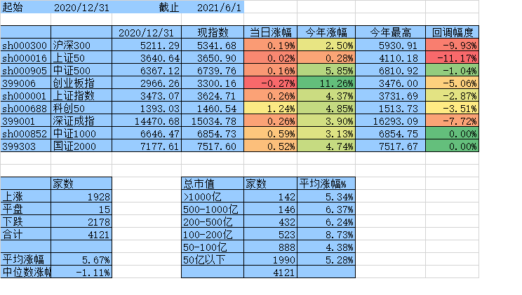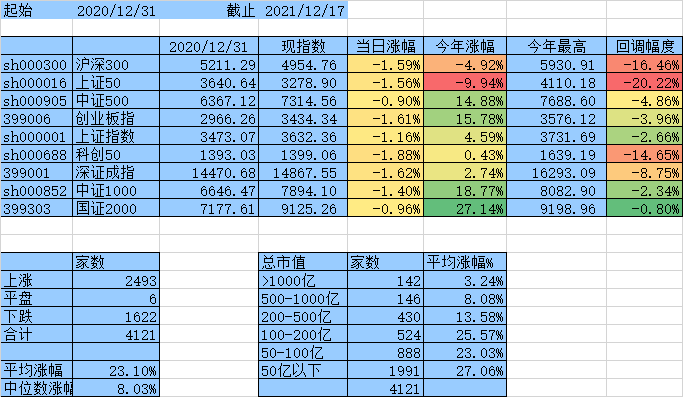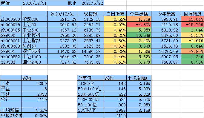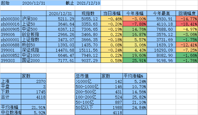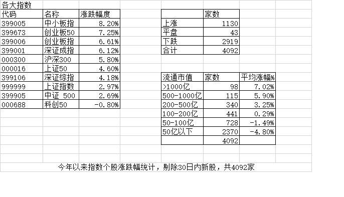 上涨家数终于跟下跌家数持平了,涨幅中位数达到0,平均涨幅7.61%,除沪深300、上证50外其他指数年涨幅均为正数。