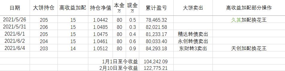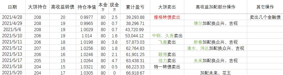 历史不会简单的重复,但历史会重复。如果参照2020年,现在的可转债市场可能接近 2020年5月-2020年6月。可转债的阶段性高点可能就在眼前。因此近期我可能会停止高收益转债加配的投入,如果价格继续上涨,会清仓所有高于 103元的大饼。