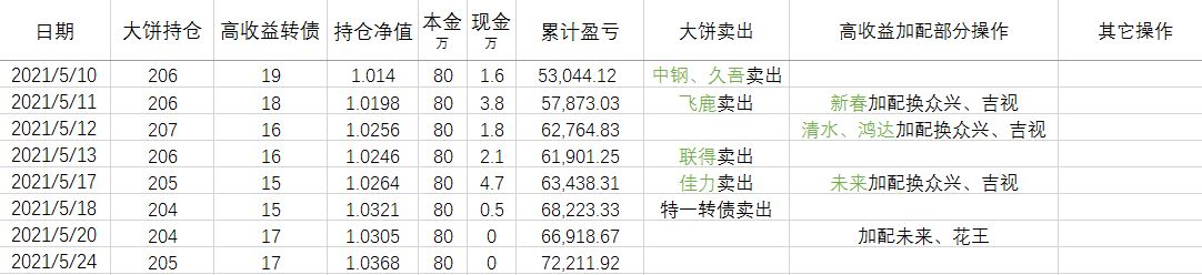 总的来看,22年起步正股摘帽是没有悬念的事情。短期内,公司正式回复上交所5月28日问询函可能将继续刺激股价上涨,存在一定的博弈机会。因此,将起步转债持仓加到1000张,目标价103元。由于这笔买入不符合大饼、高收益转债加配的标准,故算作其他操作。