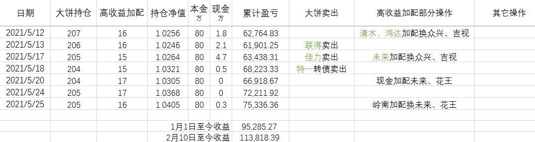 我为可转债转债策略预留了 100万资金,不过年后可转债涨势不断,有 20万资金一直没有进来。4月10日左右,开始用这部分资金买入场内大宗商品ETF基金(能源化工、有色ETF、信诚商品),在5月10日大宗商品基金盈利达到高点。这在帖子中都有记录。