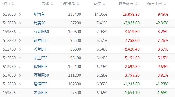 5月27日完成建仓的一批ETF获利颇丰。除了农业ETF 亏8% 认赔出局外,新汽车、芯片收益都在20%+,互联网、军工、证券、传媒、通讯收益都在5%。择机止盈。