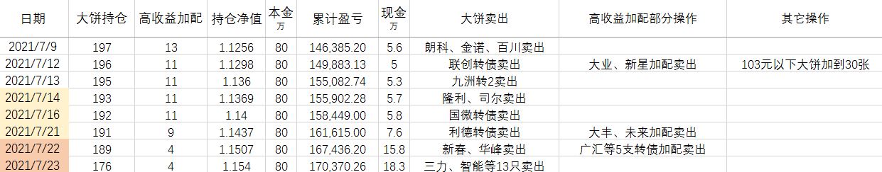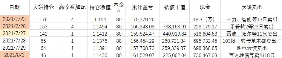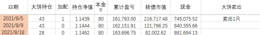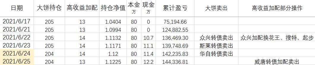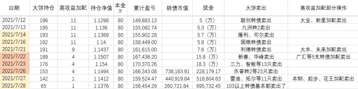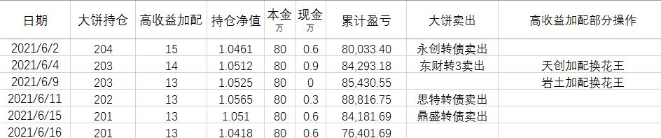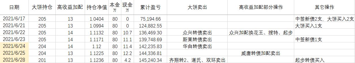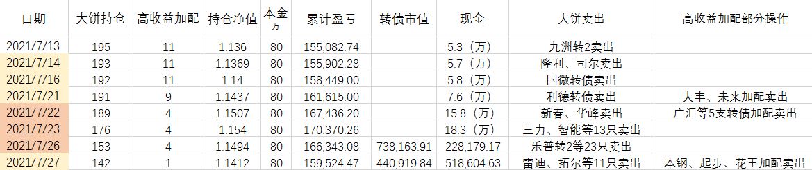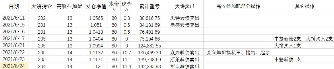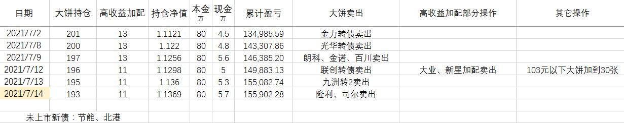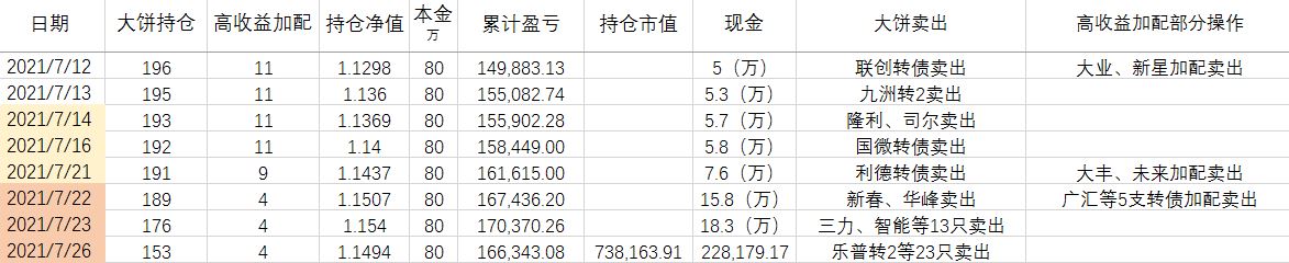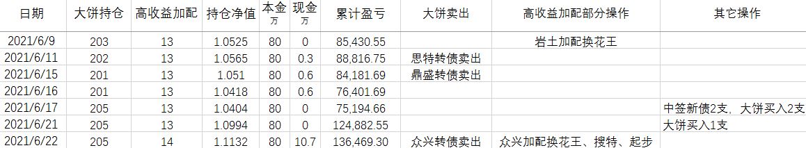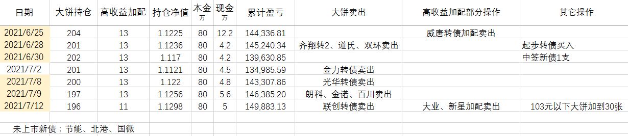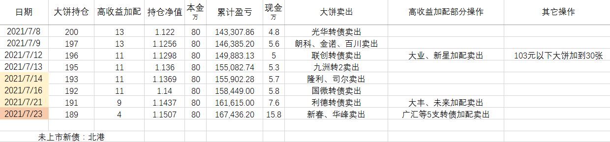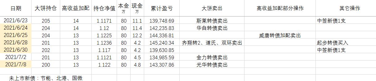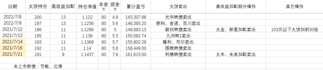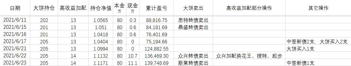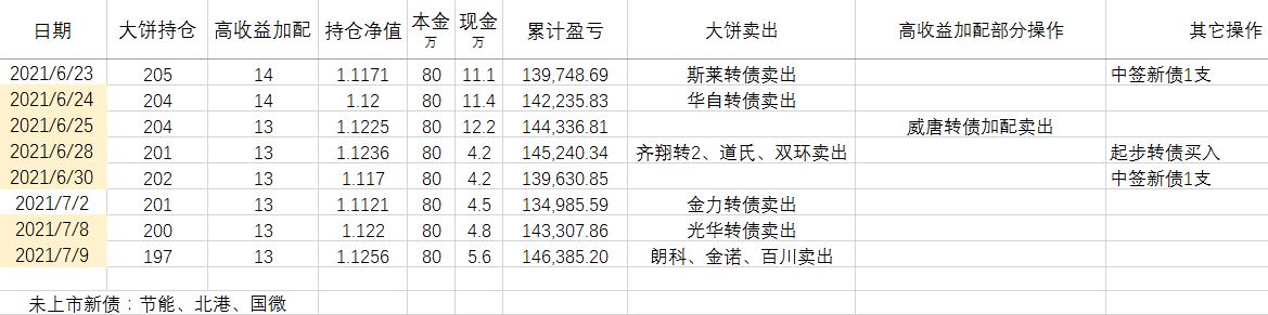 卖出策略:对于大饼,1.持有到强赎退市 2.价格冲击 150元考虑卖出。对于重仓加配的高收益转债,预先设定目标价,一般来说是到期收益率归零时的价格。