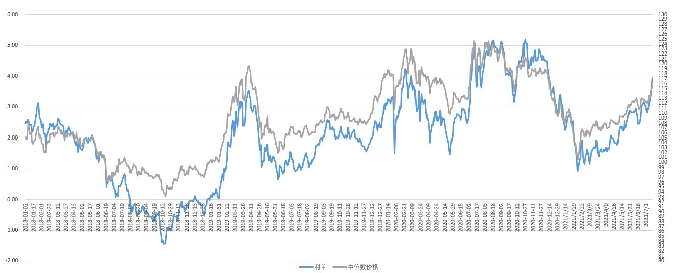 风险控制:判断转债市场整体的价格水平,主要从价格中位数和到期收益率两个方面考虑。对于低价转债而言,以收益率定价的成分更高一些,即所谓的“债性”。因此以可转债到期收益率与国债收益率做对比得到“利差”。当利差大于4且中位数价格大于117时,从历史上看可转债价格均处于高位,此时宜清仓全部高收益转债。当价格和利差继续上升,清仓全部103元以上转债是比较合适的。