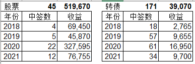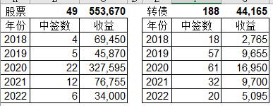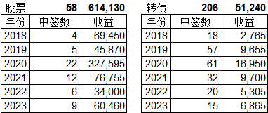 转债:2018年18签收益0.28,2019年57签收益0.97,2020年61签收益1.70,2021年32签收益0.97,2022年20签收益0.51,2023年15签收益0.69,6年合计5.1。