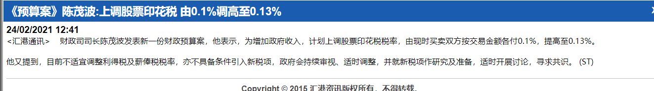 香港财政司司长:拟将港股印花税由0.1%调高至0.13%