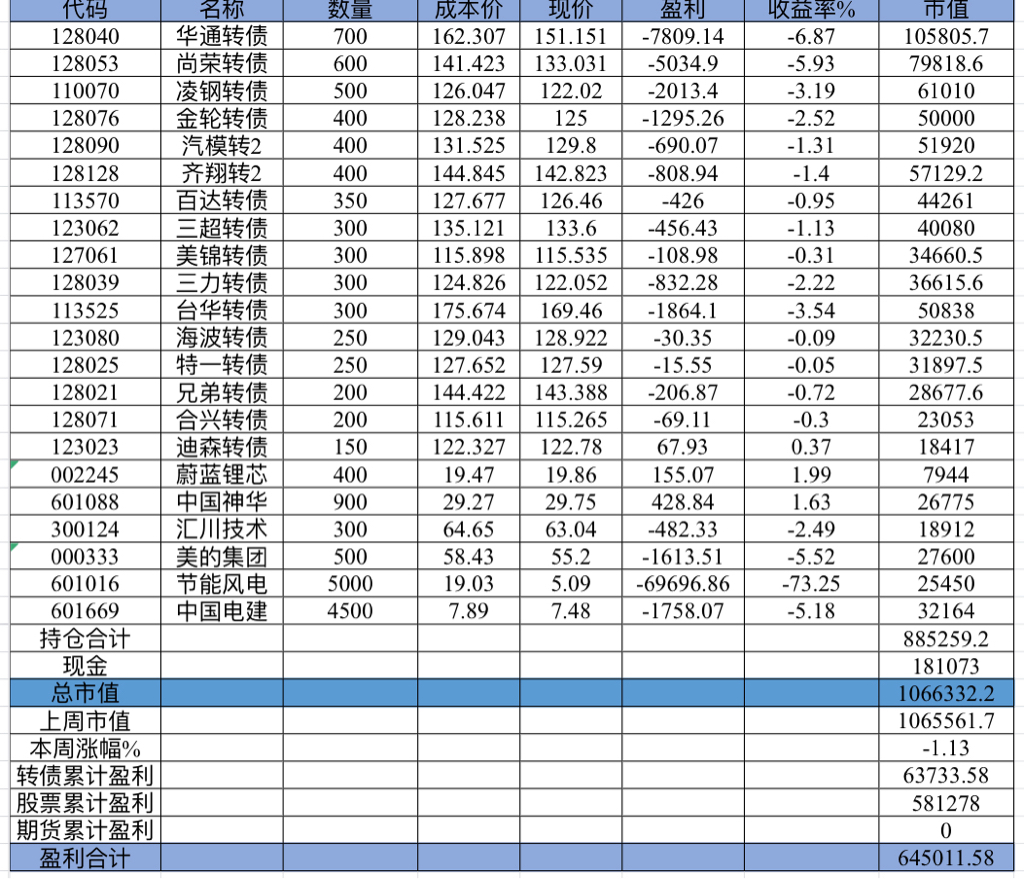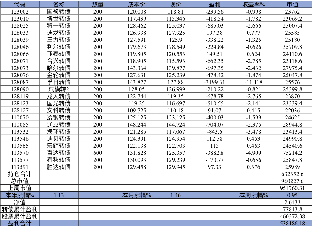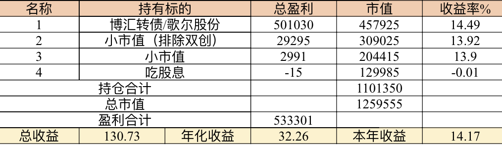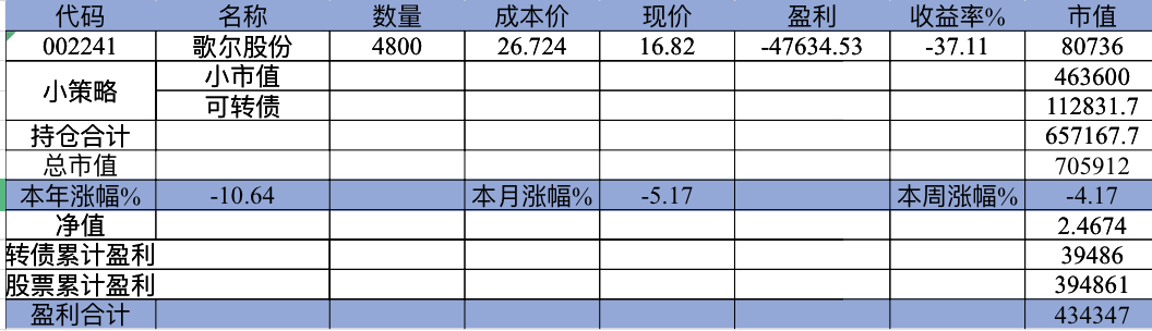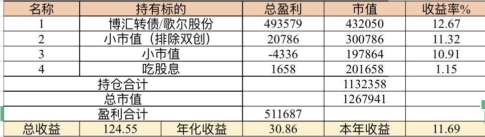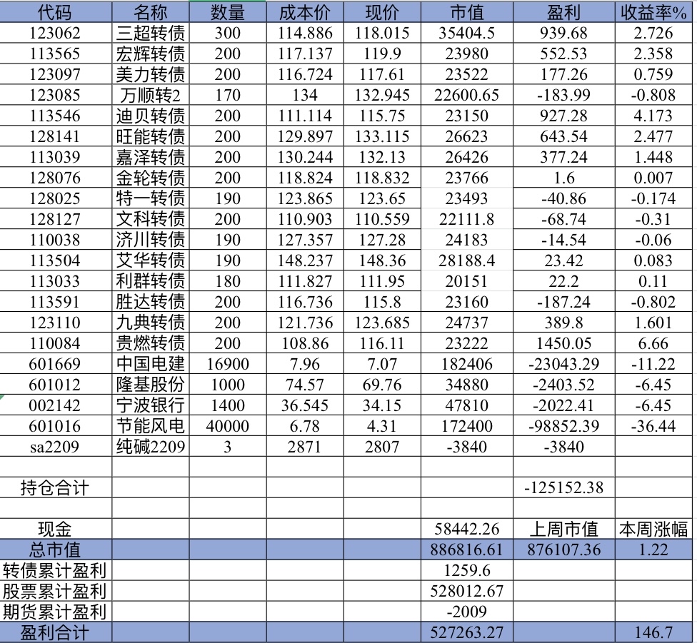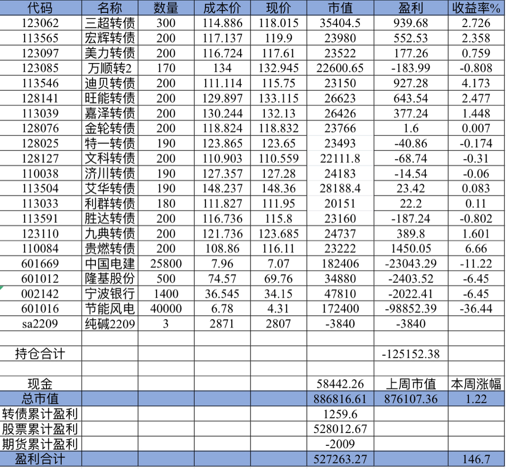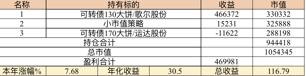 22年结束了,和ld两个人总计-11.96%;今年做的很差,先是在年初那波下跌中不断补仓,导致两个股合计占总的近九成仓,但越补越跌,一直跌到四月初受不了割肉了,这部分时间亏了近20w,倒在黎明前的黑暗;随之反弹抄了金老师的作业,平均有6成的仓位,最高有9成多的仓位可转债;一直到8月中旬一度盈利7个点,后可转债开始暴跌,割肉,降低仓位,转入130策略,如果坚持下去后面反弹会回收部分损失,可惜又在黎明前的黑暗倒下,亏损越来越大。中途买了2成歌尔踩雷,说多了都是泪。明年继续抄金老师的小市值,专门单独一个账号操作,2成的仓位,可转债目前持有是亏损的,慢慢清掉去,这部分换成权益仓。今年是这么多年来年收入(算上工资)为负的,18年那么难也有6.8%的增长。期望明年能有个好收成,也祝大家明年收益长虹!