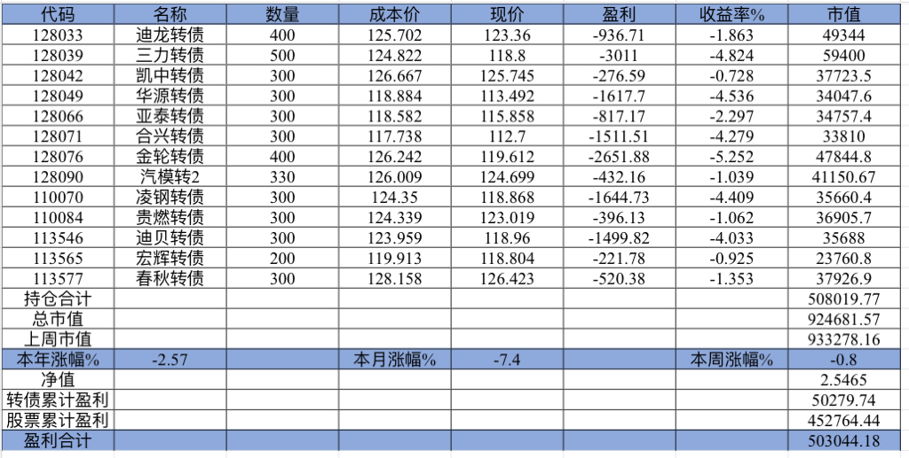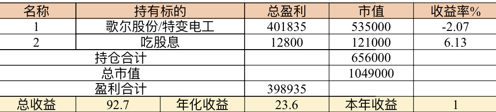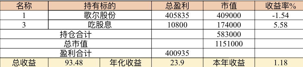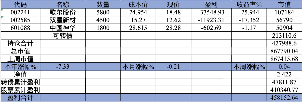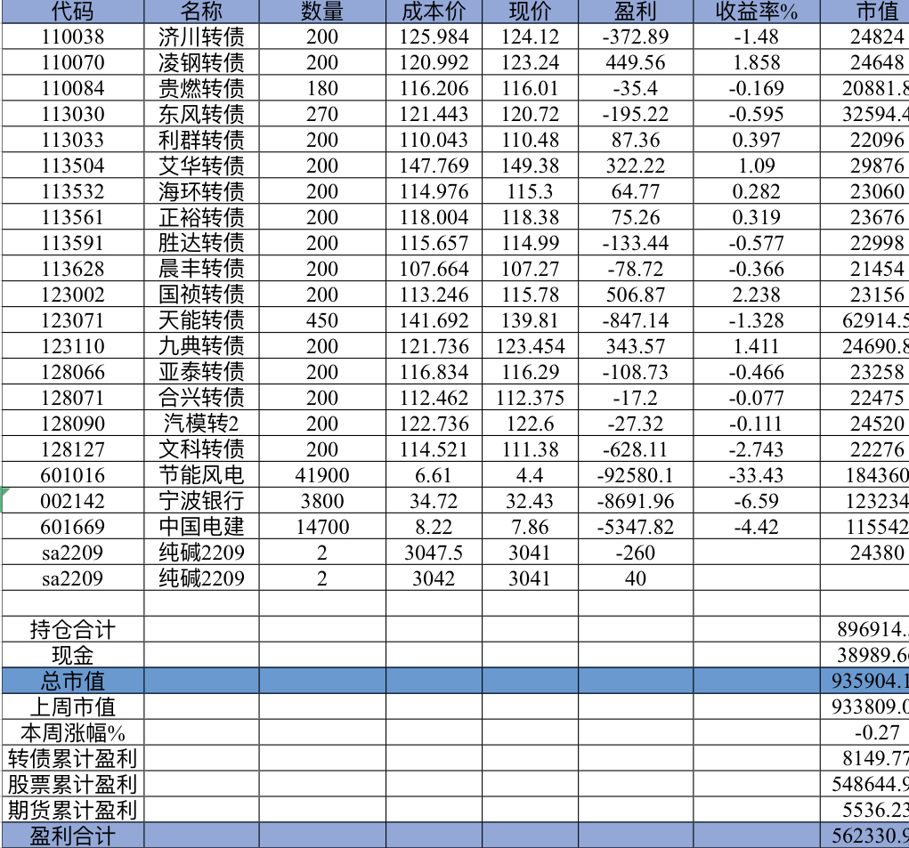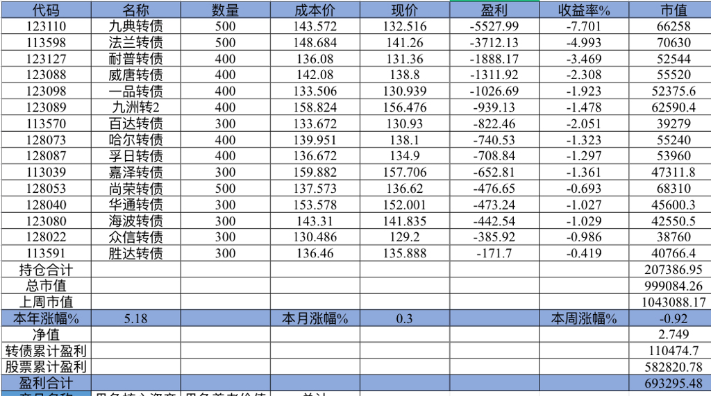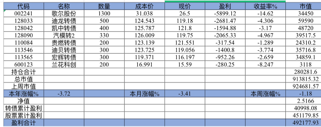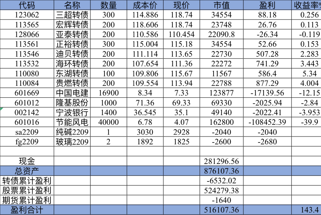 22年结束了,和ld两个人总计-11.96%;今年做的很差,先是在年初那波下跌中不断补仓,导致两个股合计占总的近九成仓,但越补越跌,一直跌到四月初受不了割肉了,这部分时间亏了近20w,倒在黎明前的黑暗;随之反弹抄了金老师的作业,平均有6成的仓位,最高有9成多的仓位可转债;一直到8月中旬一度盈利7个点,后可转债开始暴跌,割肉,降低仓位,转入130策略,如果坚持下去后面反弹会回收部分损失,可惜又在黎明前的黑暗倒下,亏损越来越大。中途买了2成歌尔踩雷,说多了都是泪。明年继续抄金老师的小市值,专门单独一个账号操作,2成的仓位,可转债目前持有是亏损的,慢慢清掉去,这部分换成权益仓。今年是这么多年来年收入(算上工资)为负的,18年那么难也有6.8%的增长。期望明年能有个好收成,也祝大家明年收益长虹!