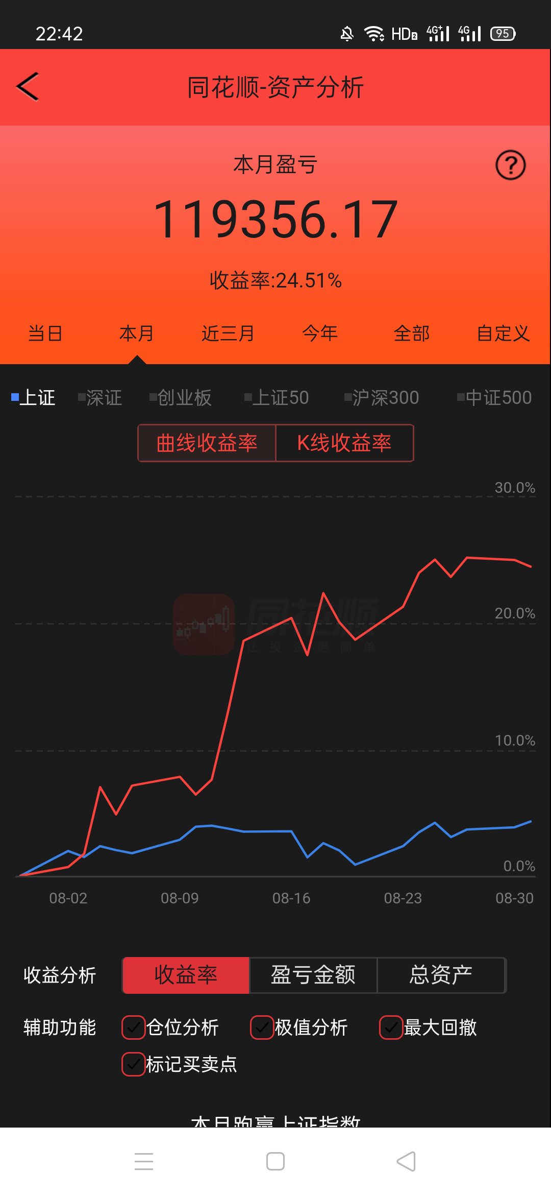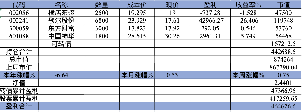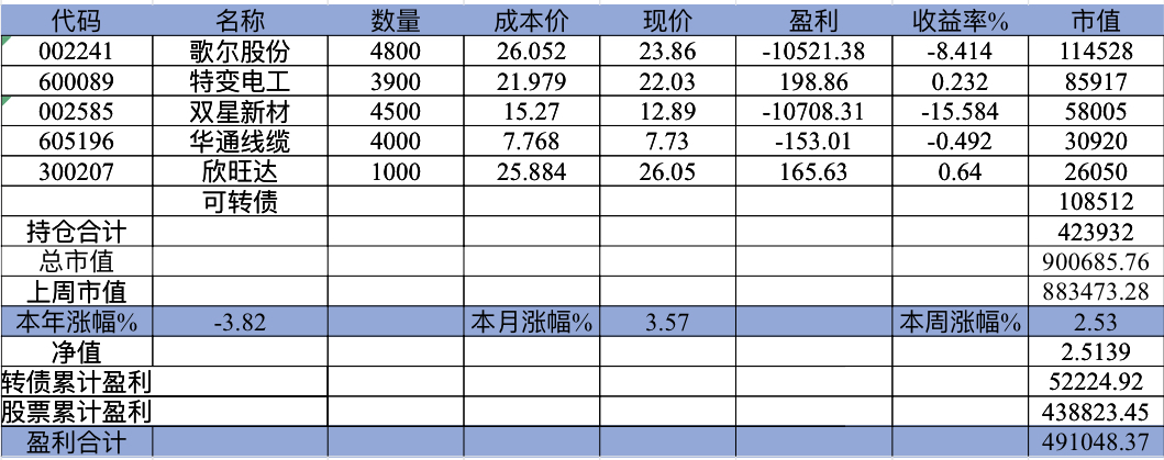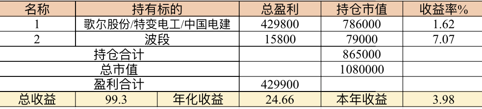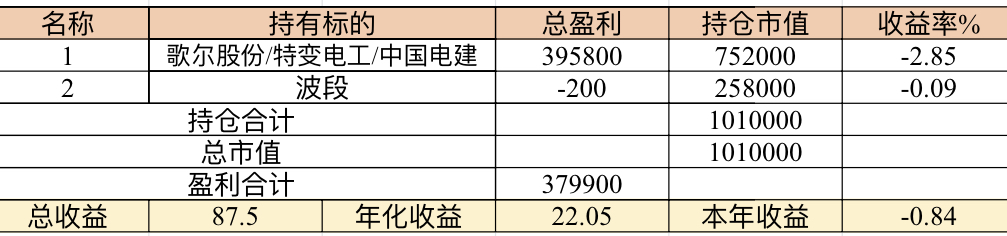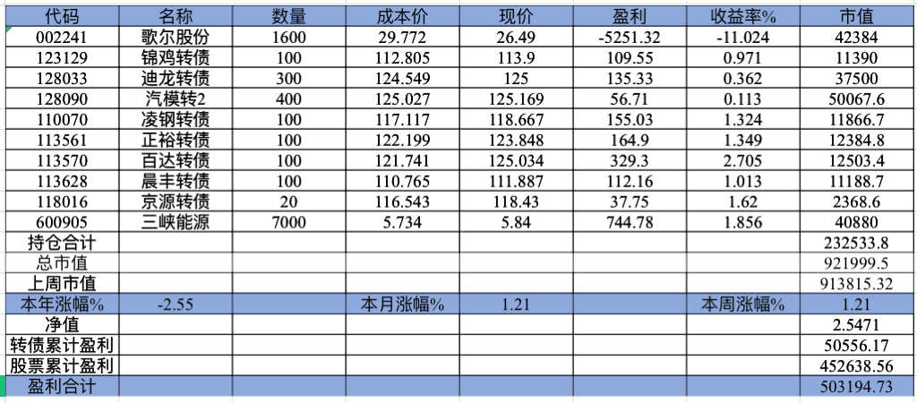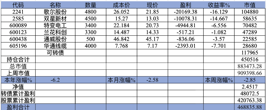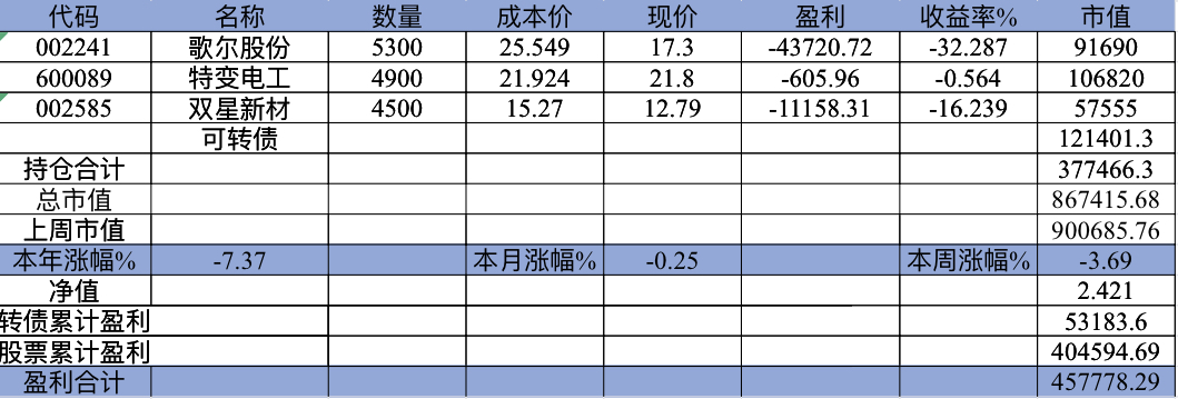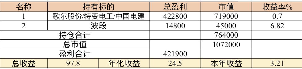 22年结束了,和ld两个人总计-11.96%;今年做的很差,先是在年初那波下跌中不断补仓,导致两个股合计占总的近九成仓,但越补越跌,一直跌到四月初受不了割肉了,这部分时间亏了近20w,倒在黎明前的黑暗;随之反弹抄了金老师的作业,平均有6成的仓位,最高有9成多的仓位可转债;一直到8月中旬一度盈利7个点,后可转债开始暴跌,割肉,降低仓位,转入130策略,如果坚持下去后面反弹会回收部分损失,可惜又在黎明前的黑暗倒下,亏损越来越大。中途买了2成歌尔踩雷,说多了都是泪。明年继续抄金老师的小市值,专门单独一个账号操作,2成的仓位,可转债目前持有是亏损的,慢慢清掉去,这部分换成权益仓。今年是这么多年来年收入(算上工资)为负的,18年那么难也有6.8%的增长。期望明年能有个好收成,也祝大家明年收益长虹!