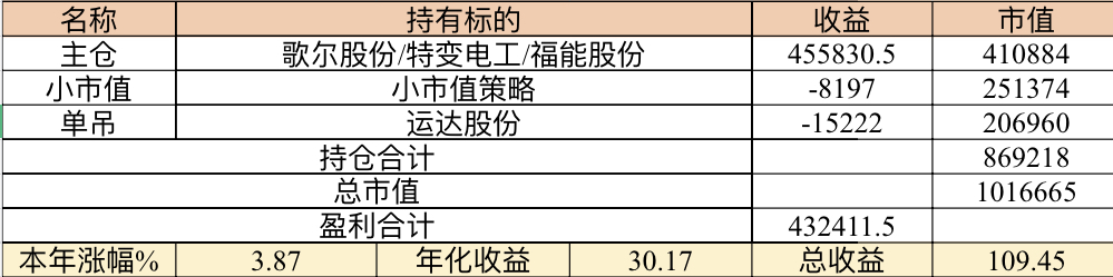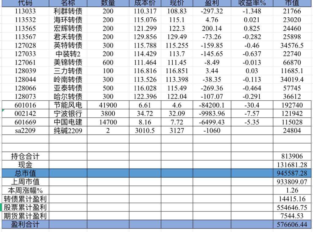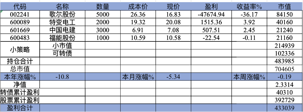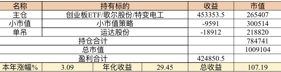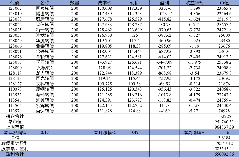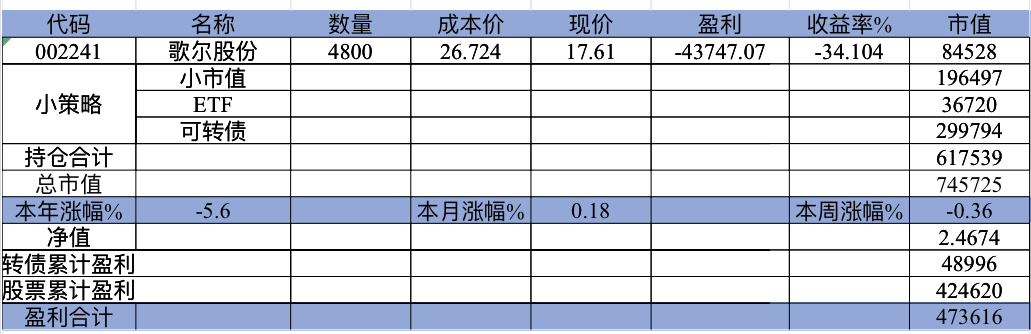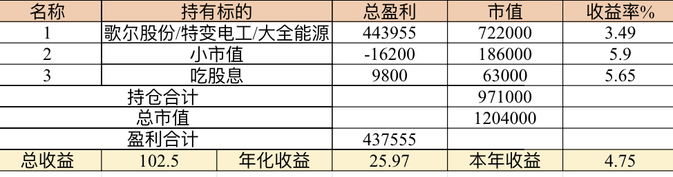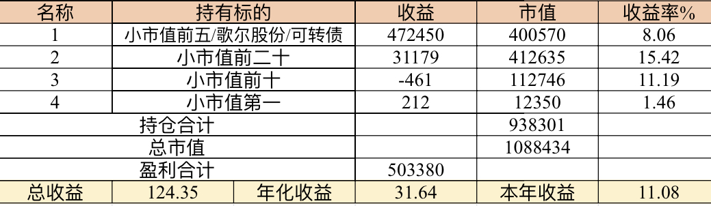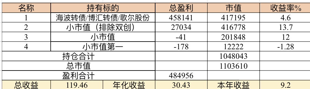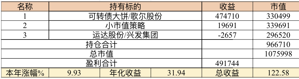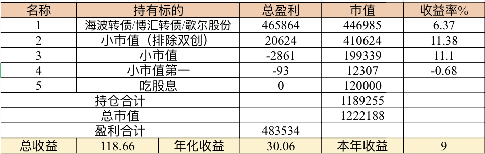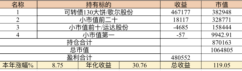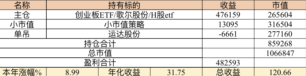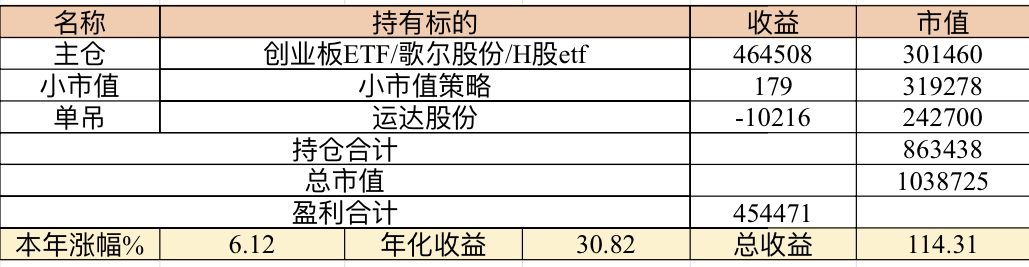 主账号今年成绩是最差的,亏损基本来自于它,主要2月和8月下跌时乱动造成的大亏损,小市值和可转债是无脑按排名轮动;小市值本周开始的,按金老师的策略无脑轮,每次10只,期待它创造佳绩。ETF本周建仓,H股ETF和恒生医疗两只。