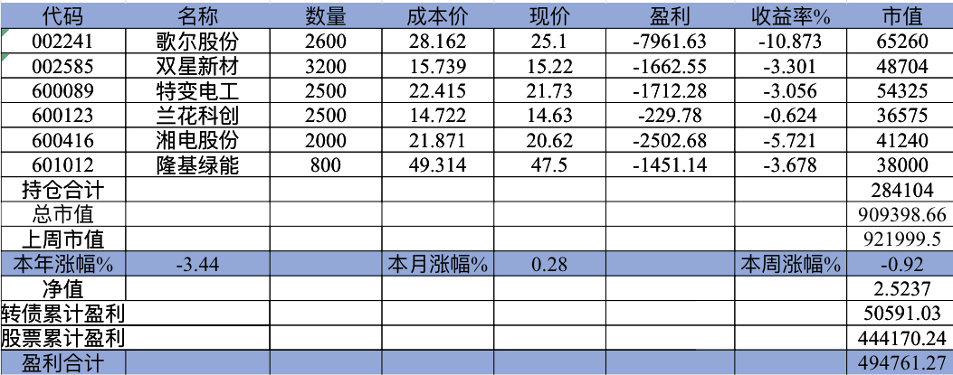 目前持有江化微,吉电股份,海康威视,隆基股份,龙佰集团,和而泰,恒力石化,兴发集团,爱尔眼科,五粮液,歌尔股份。