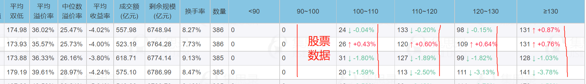 @天书 各个价格区间的转债对应正股的涨跌幅数据还能做到转债指数里吗?帖子看的人挺多的。可以在图片标注位置加上正股涨跌,最好再画一根正股等权指数涨跌曲线就更好啦。
