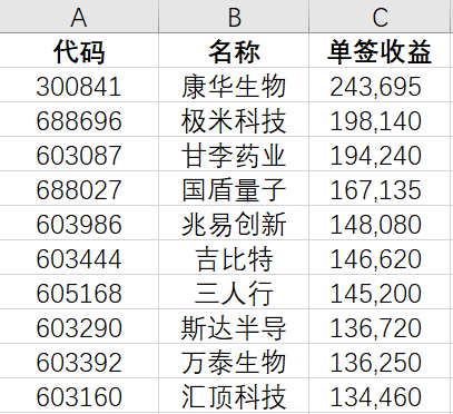 昨天想看一下A股大肉签都有哪些,百度了一下好像没有说的清楚的,因此查了一下我们的后台数据,算是给互联网贡献点内容吧:)以开板当日收盘价计算单签收益,如图: