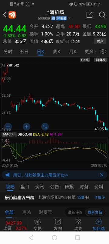 上海机场,垃圾股票。继续跌