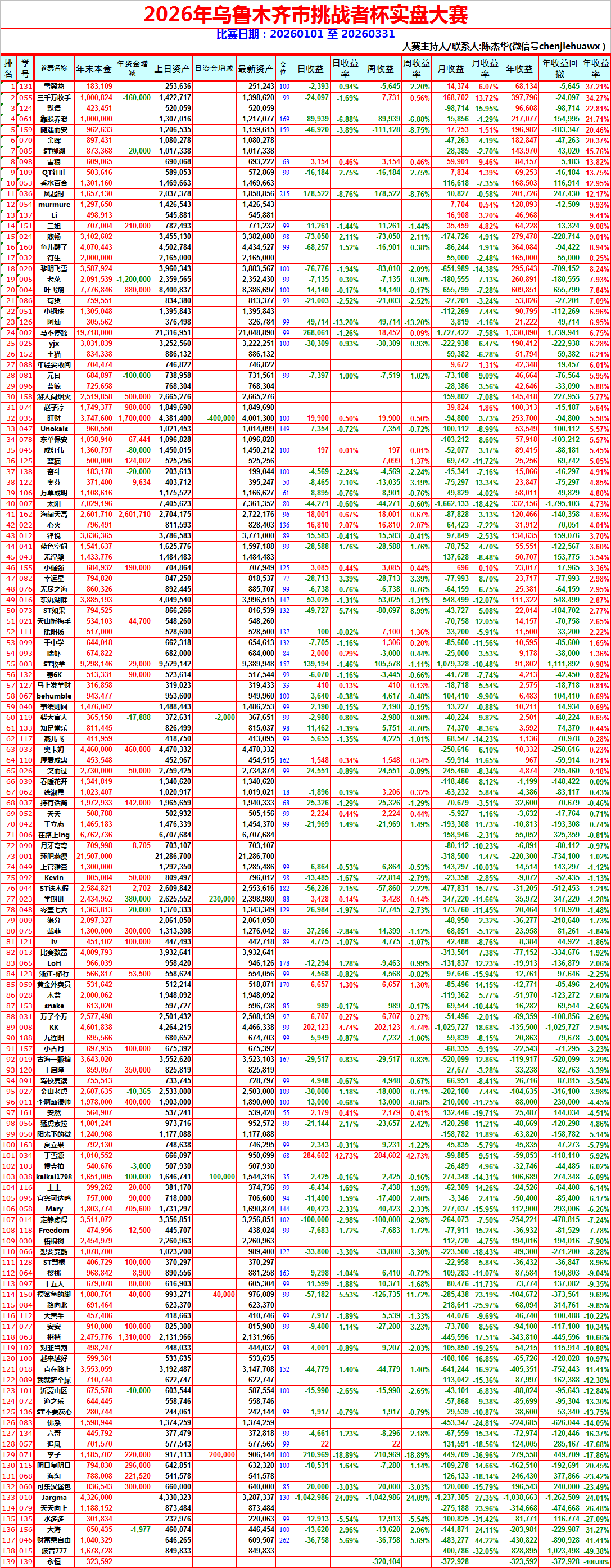 我昨天气的肚子疼,十年前我开始系统的传授徒弟,其中有一个同龄人金融系统的公务员,2019年拜在我门下,从策略的建立、原理、执行、应对、完善,事无巨细,倾囊相授,他老人家2019投入5w,因为各种十万火急的事情又取了10来万,因为他资产少,我多次降低挑战者杯实盘大赛的参赛门槛,控制在10万,我监督他执行策略5年,连续五年盈利,第六年不管了,他马上放飞自我,告诉我,师傅,咱们的策略每年都有无数牛股,我想看看能不能抓住几个,我无言以对。今天通知我,他已经把钱取出来准备给他妈妈在家乡买房,还想在比赛看看,我能说啥?
