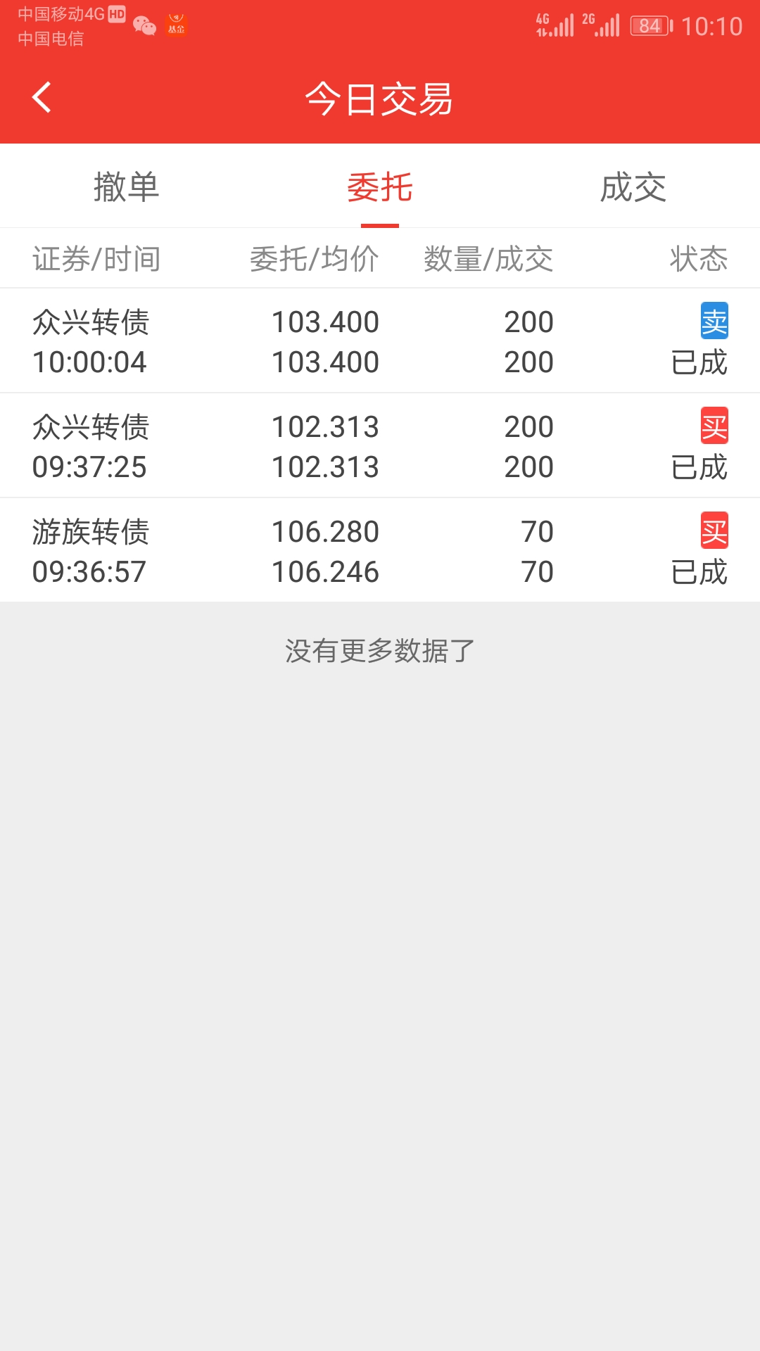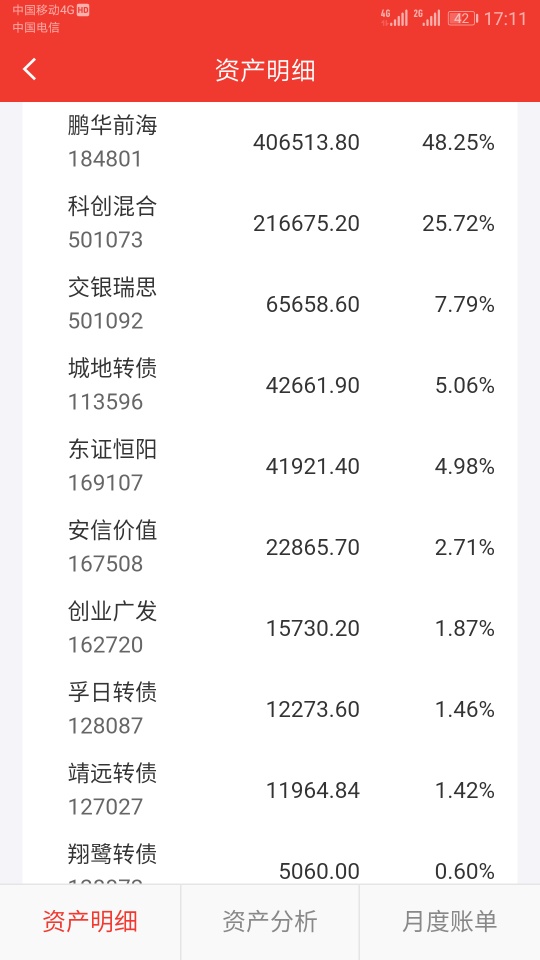 今天对可转债和开基调仓,卖出兄弟、未来买入济川,卖出强力、思创、塞力等全部买入紫银,卖出全部兴全多维价值、交银先进制造、交银启明买入诺安双债,卖出中银益利(打新逻辑已变)3w买入易方达双债,跟风申购鹏华高收益债(000290)1w,申购少量嘉实恒生中国企业,总体思路就是用转债基金代替可转债,让基金经理把握可转债最后的行情,加强防守,逐步通过基金建仓少量港股,这几天行情在鹏华前海、华宝新机遇净值新高的基础上,场内市价继续下跌,市值高点回撤2000大洋,不怕我拿2个月以上等分红。