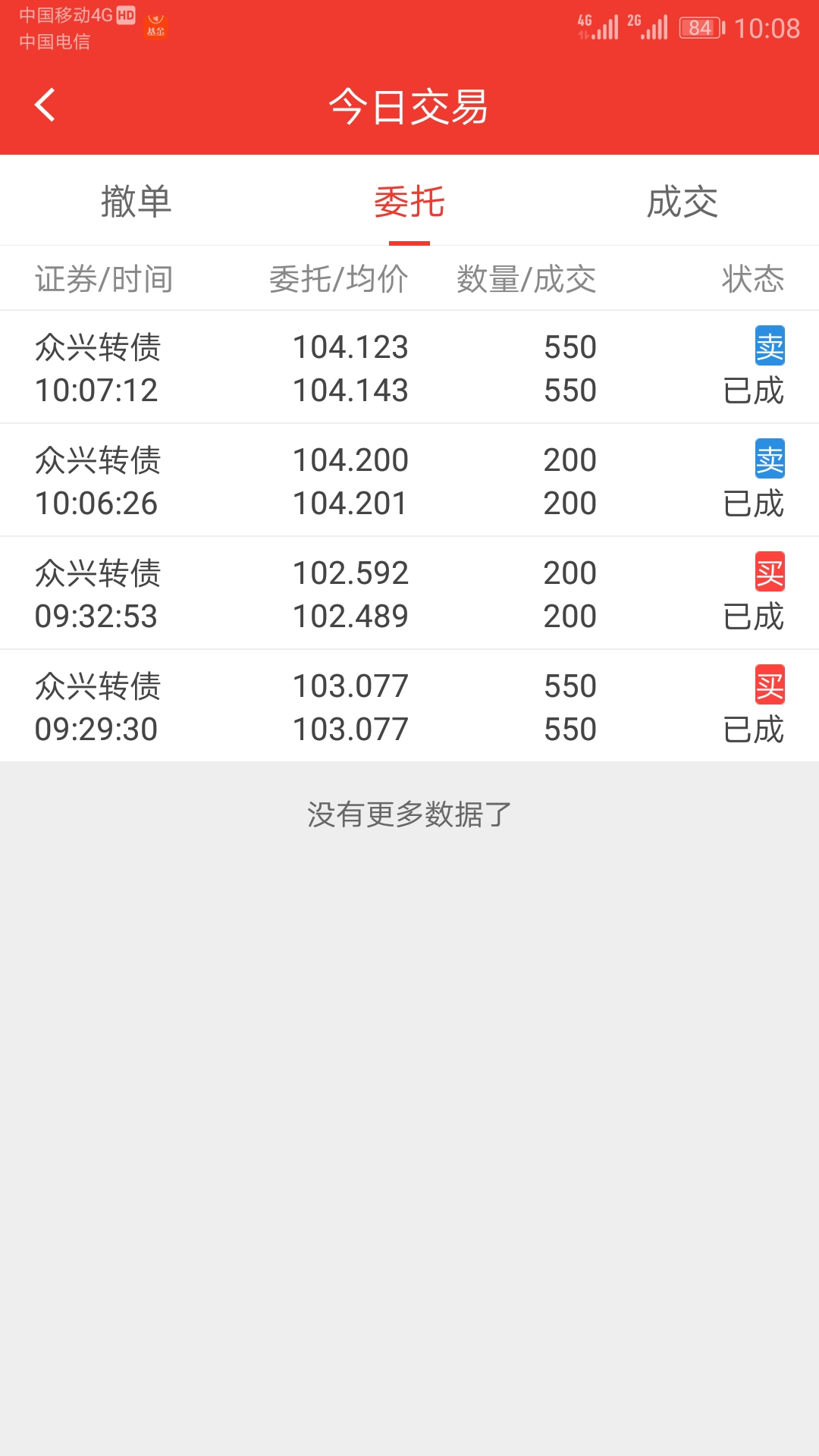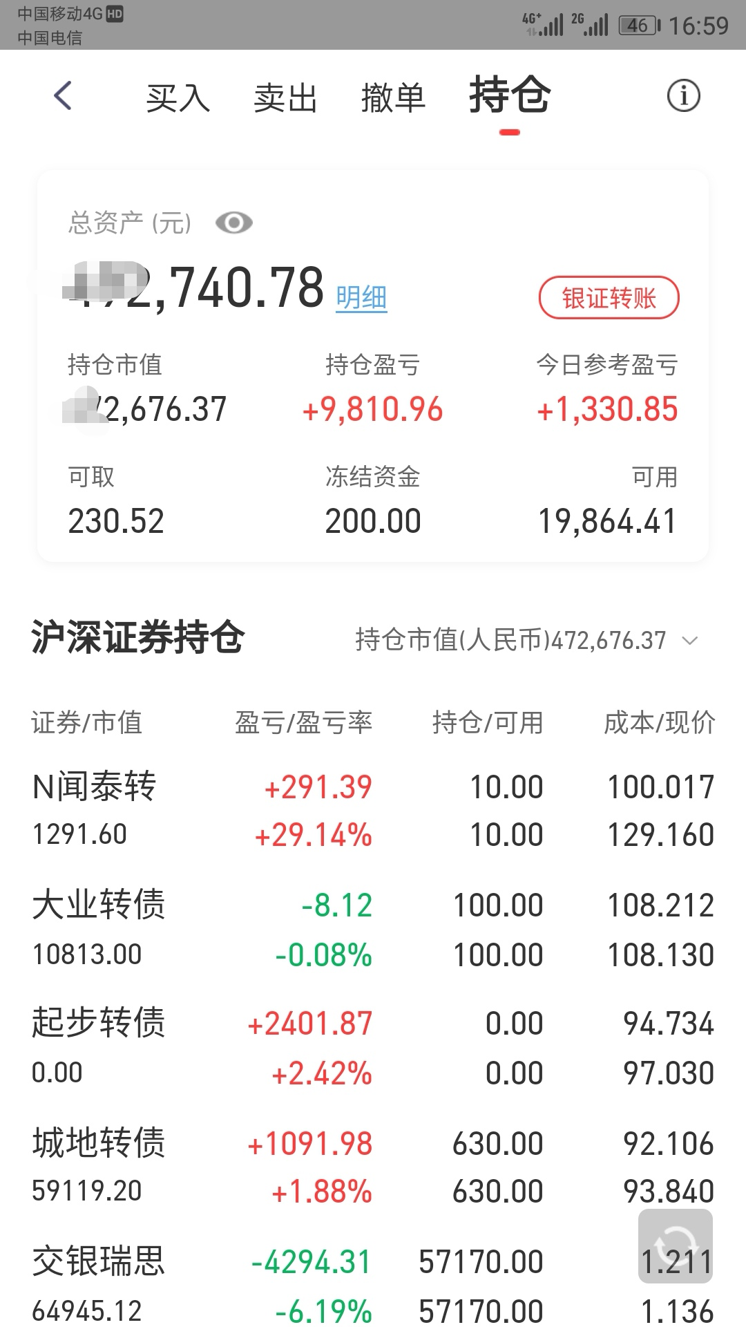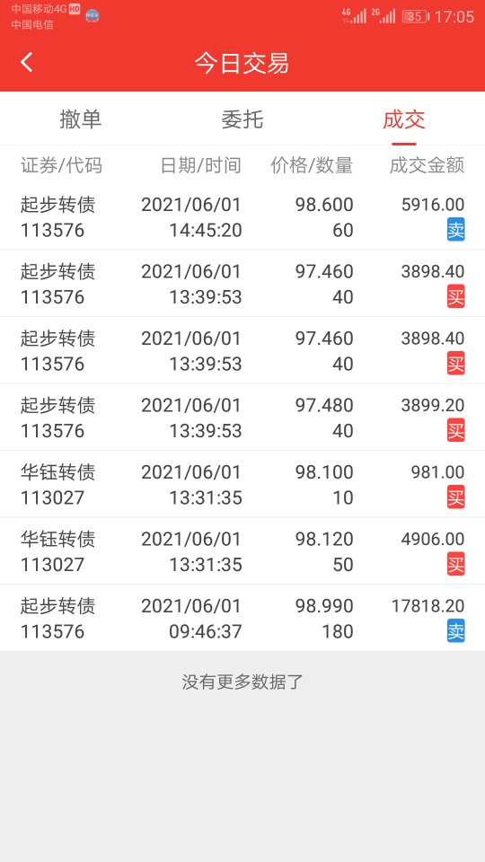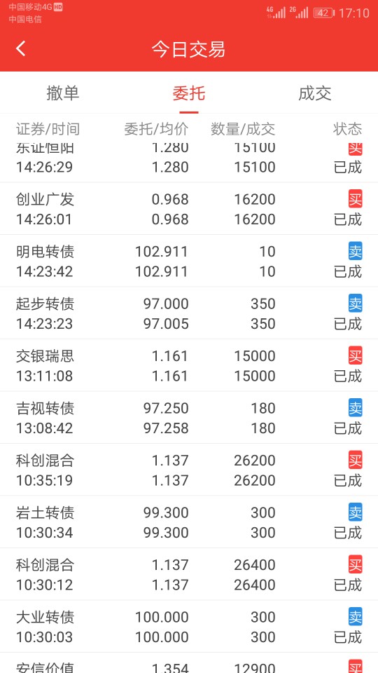 今天不错,在红相、翔鹭、吉视、孚日等转债上做了一单,收益近千元,感觉转债还未跌透,仅保留城地、三力、孚日和济川各100张,其余资金买入交银瑞丰和鹏华前海,今天的亏损主要来自开放式基金,预计1000元。