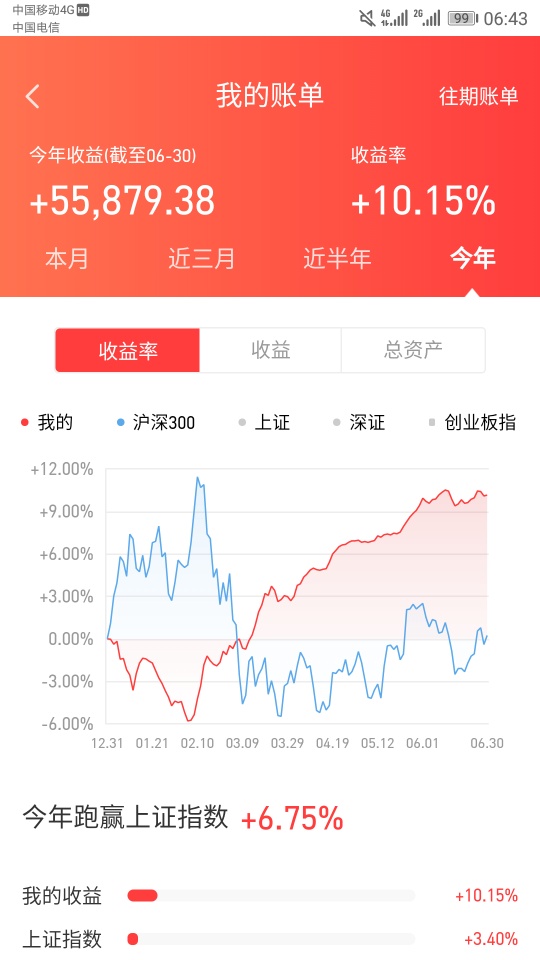 2.6月份收益受个人对下半年谨慎的影响,采取求稳布局仅收益0.65%,现在这个点位不高不低,股票贵的贵死而且还在创新高,便宜的继续趴着继续新低,不在风口很难赚钱,就是基金不拿风口的股票明星基金也变普通基金,个人就更很难适应这种投资大势,所以还是交给基金和低价转债吧,下半年只求2.5%收益,实现目标即可。