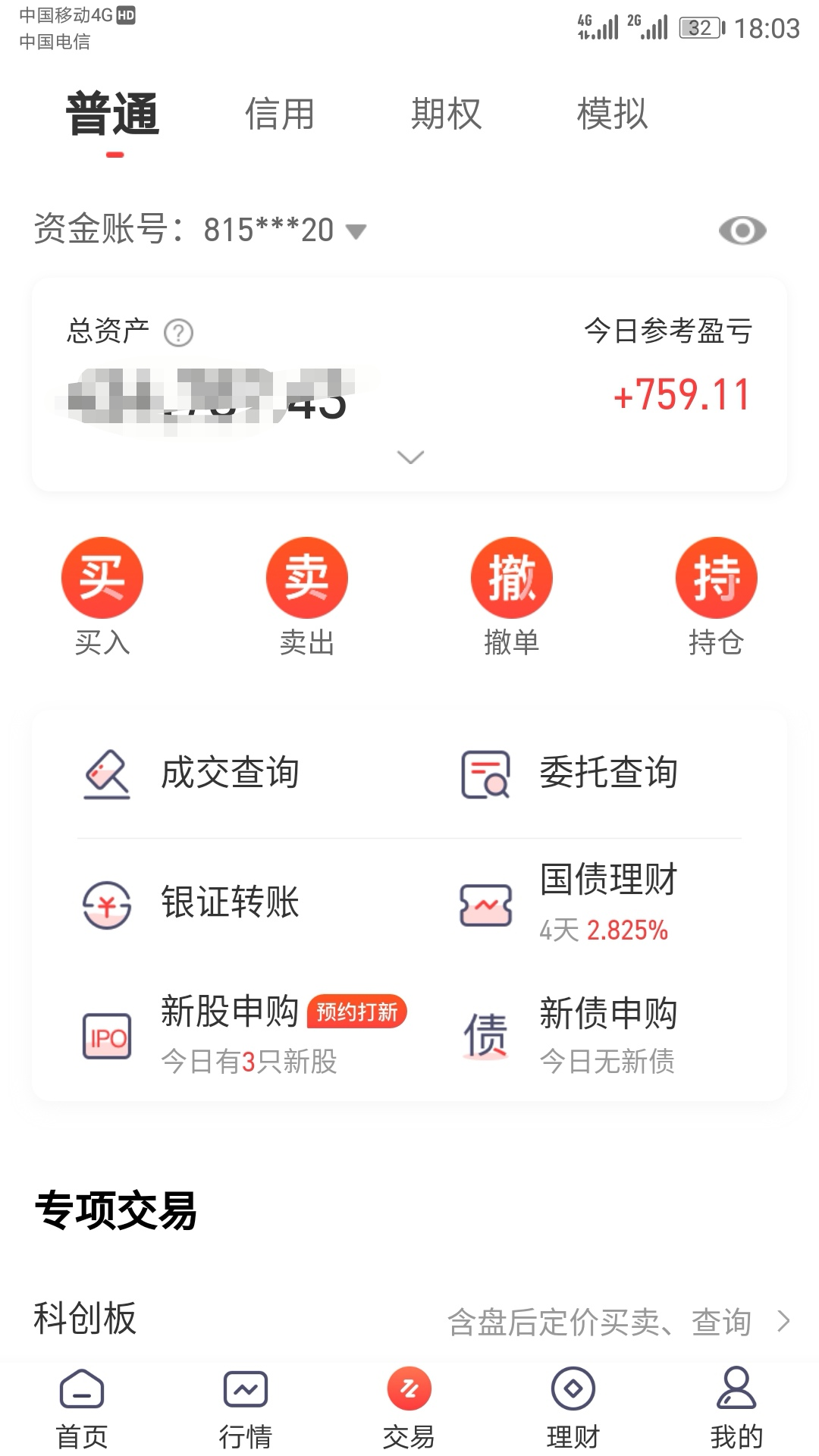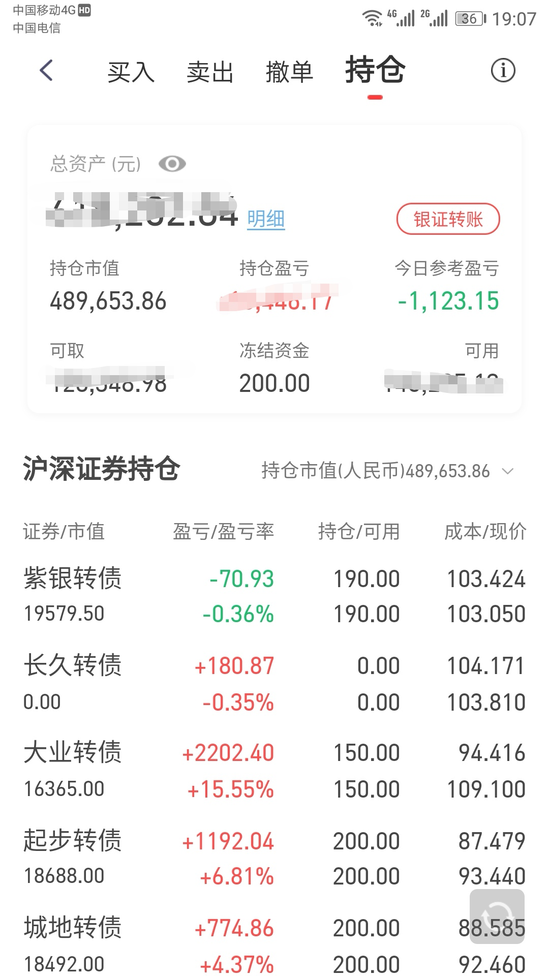 全天受鹏华前海、安信价值、交银瑞思大跌影响,继续血亏7000元,按周末研究计划加仓安信价值4w、敖东转债700张、大秦转债750张、鹏华前海1300张,冲高卖出岭南、城地,申购华宝新机遇、兴全恒鑫、兴全多维、交银启明、南方上证50ETF增强、嘉实恒生中国企业、南方核心竞争等基金共计15w以上,手上的现金进一步降低至20w。