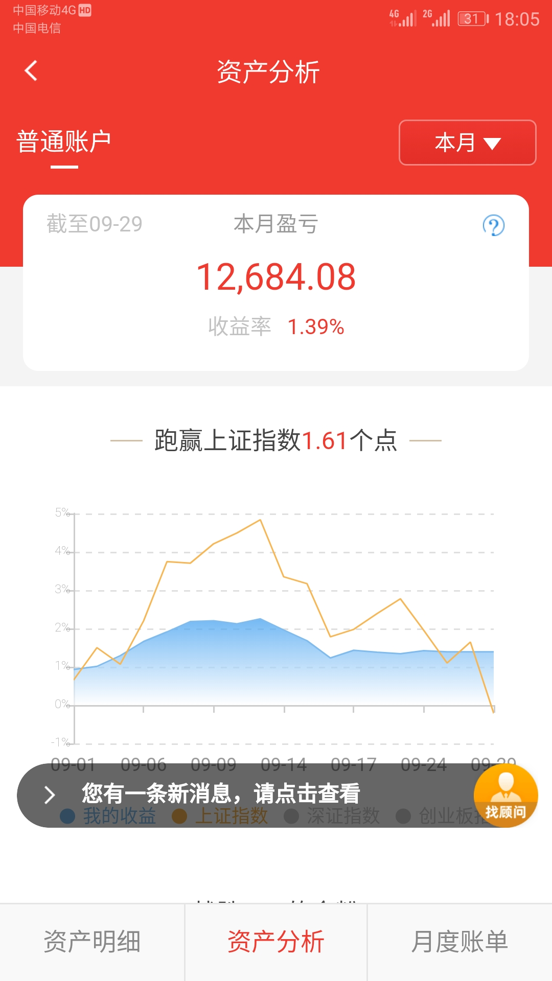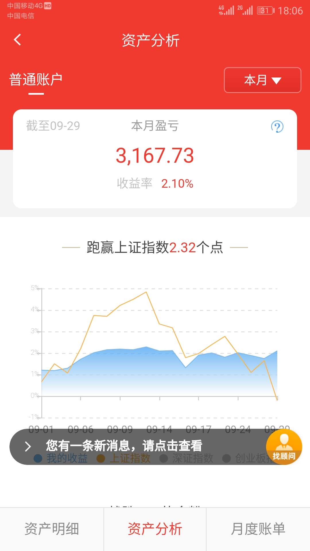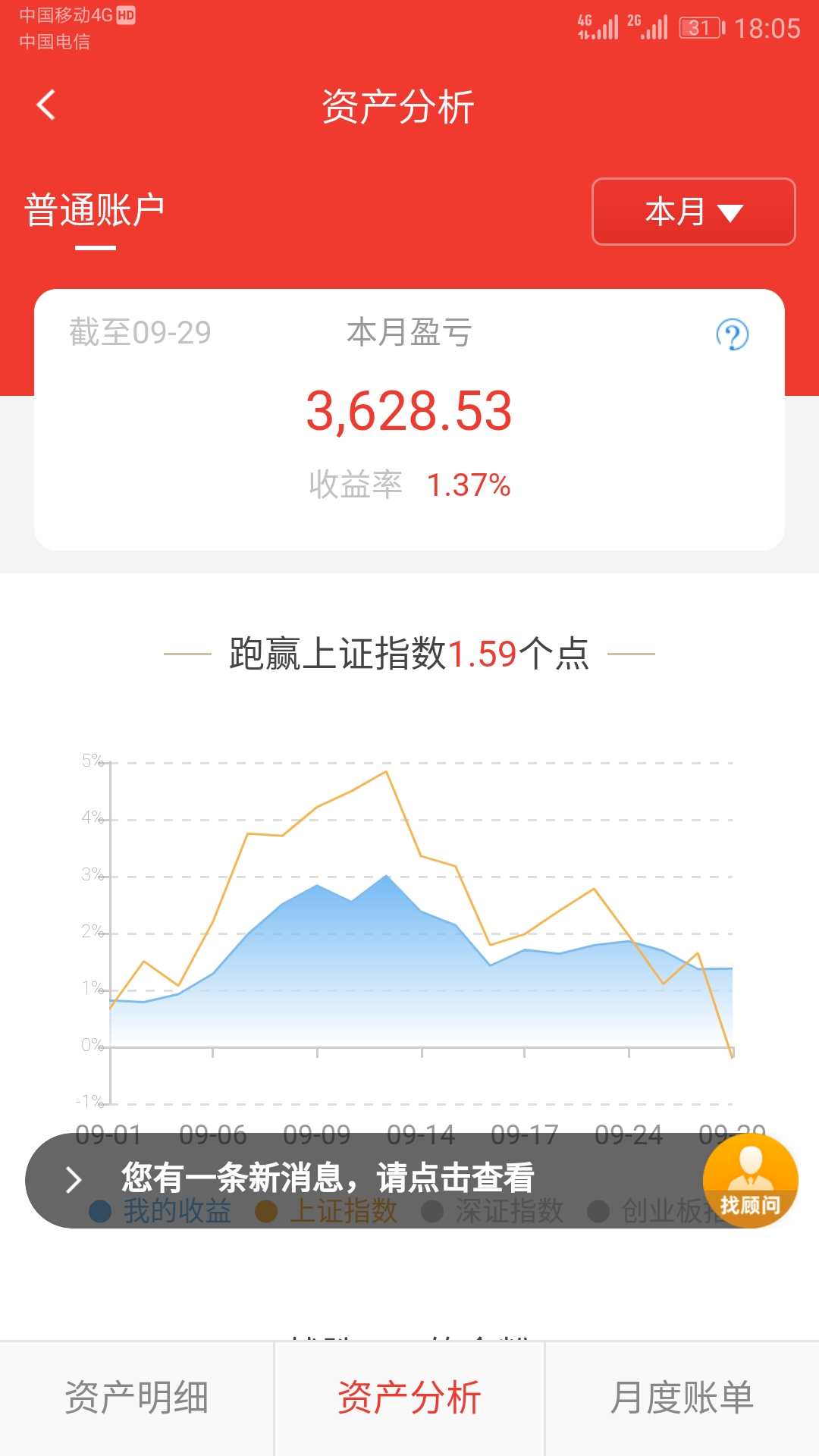 本月继续保持盈利,已经连续盈利8个月,很幸运再次压中标的,盈利主要靠转债和鹏华前海、安信价值等封基贡献,股票账户收益超过2.6w,开基亏损5k,累计收益率18.3%,下个月靠啥盈利是国庆值得思考的问题,尤其是鹏华前海的稳定盈利替代品,鹏华前海折价率持续降低,后续再大幅盈利不可继续,本日怕节后不跌卖出了大部分,手里还剩30w,目前现金占40%。