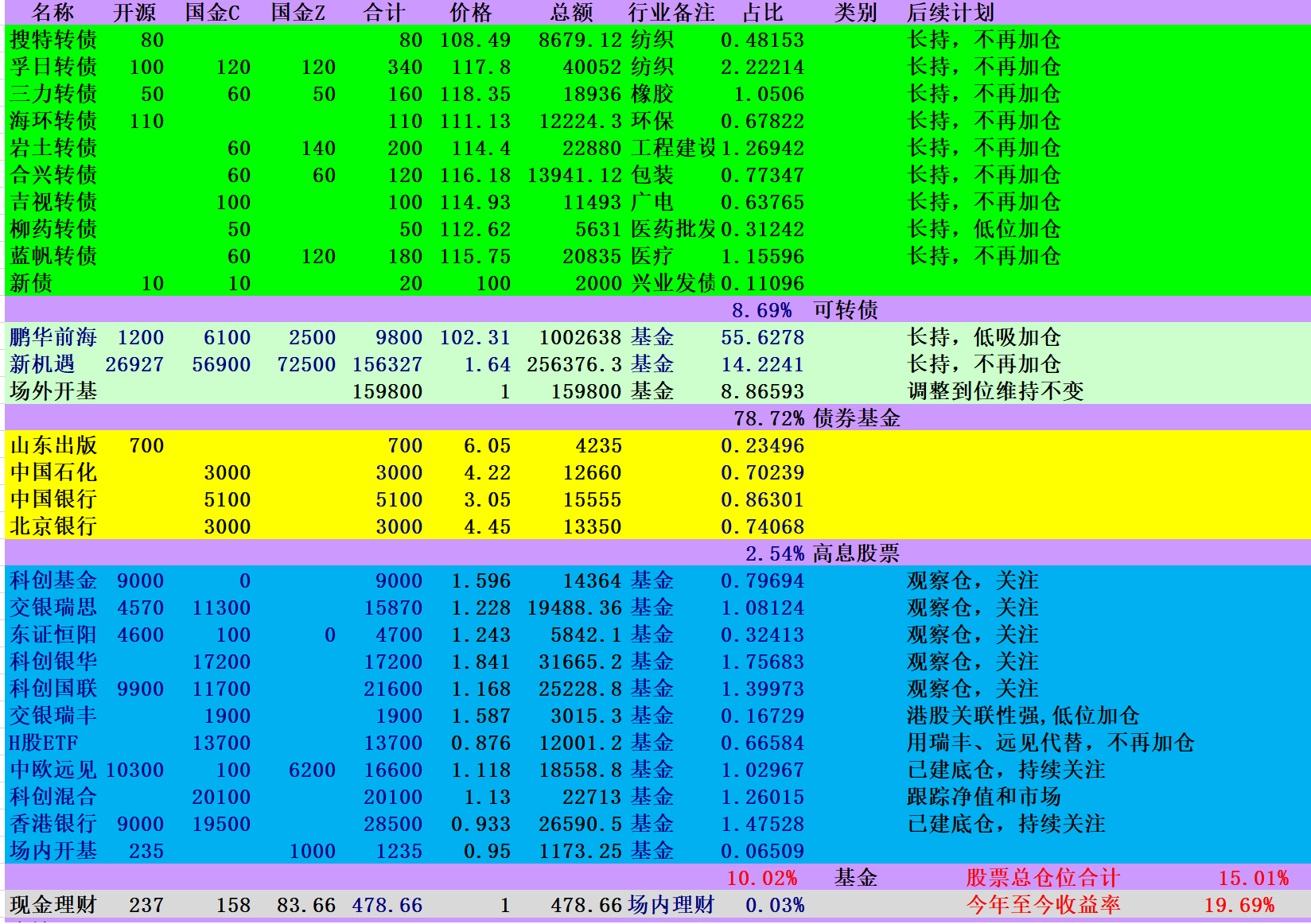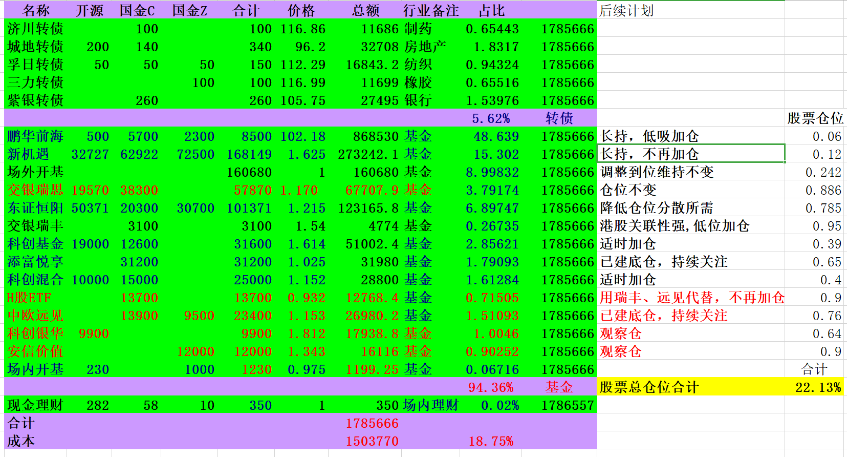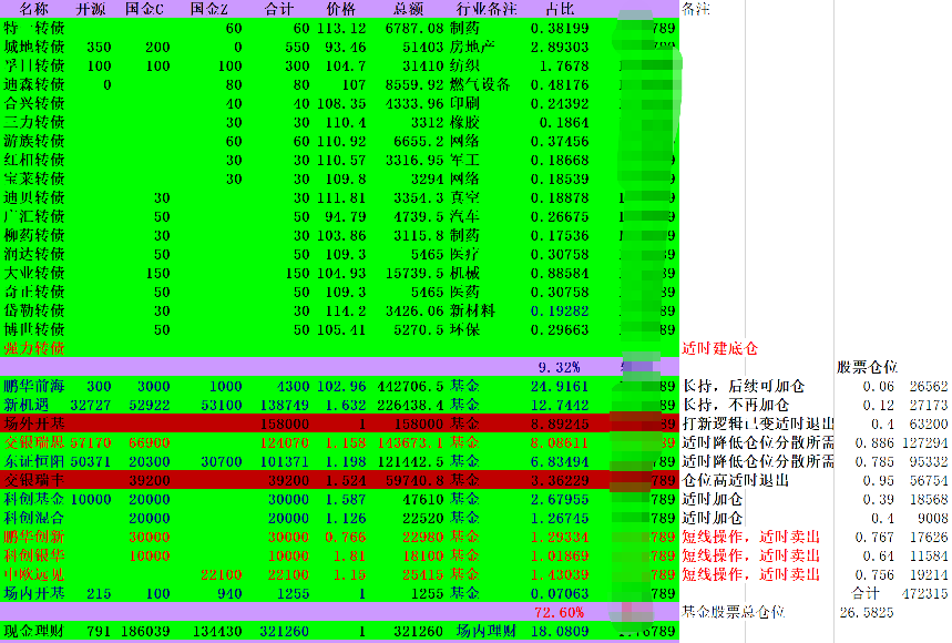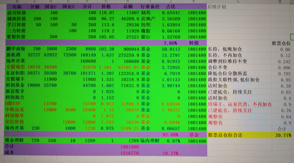本周实在太忙了,天天加班啊,除周一创出新高外其余四天小幅回撤,周损失1000元。转债卖的只剩城地、紫银、孚日、三力和济川共5只,10w有余,占比不到6%,开基中共计10w的3只可转债基金(易方达双债、诺安双利、兴全恒鑫)保持转债仓位,本周卖出的转债买入科创混合、中欧远见、鹏华前海,但效果不理想,中银益利继续减仓,开基也调整到位了; 继续小幅买入H股ETF建底仓; 股票总体仓位小幅升至22%,这样的持仓目标就是保持基金仓位等年底分红,也符合我现在的工作情况,没时间分析和做短线,为了防止去年年底的可转债快速回调,我把逃顶操作就交给基金经理了。