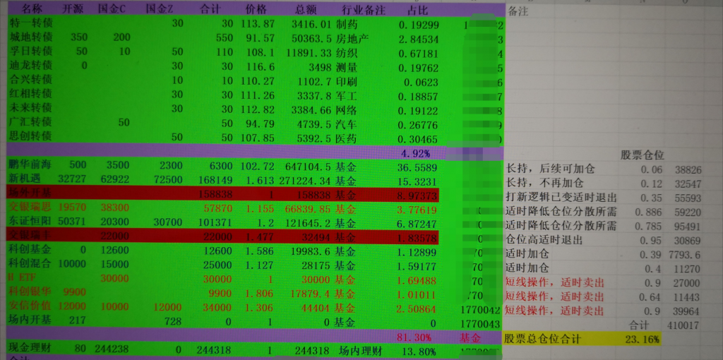 这周实在太忙了,没时间看盘,行情乏味也提不起兴趣看,晚上把手里的资产捋了捋,具体持仓如下: