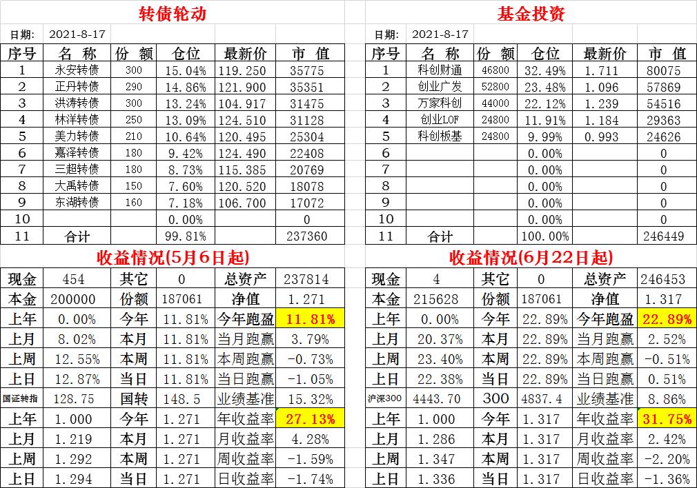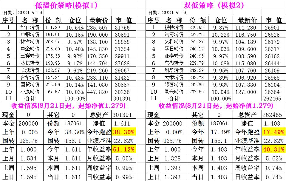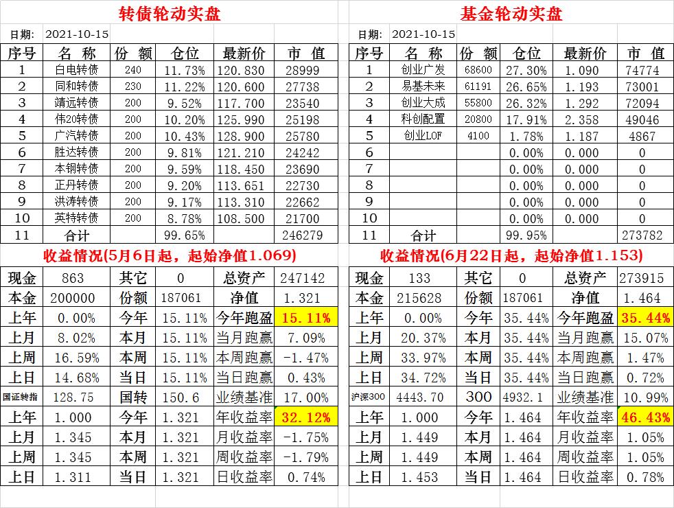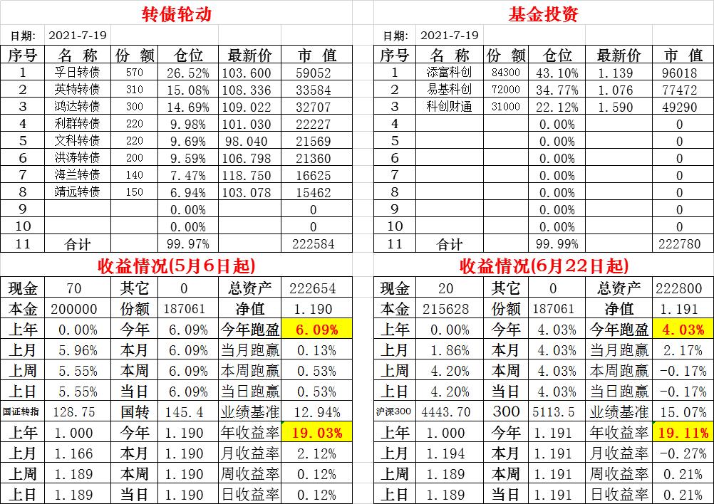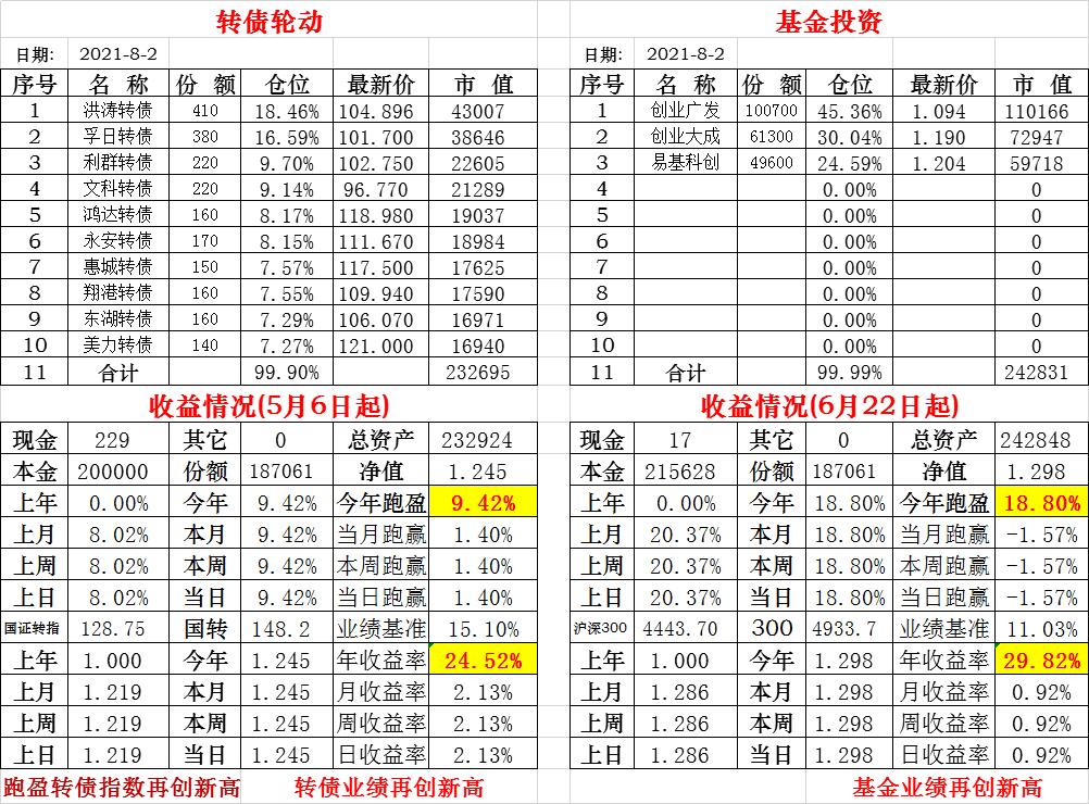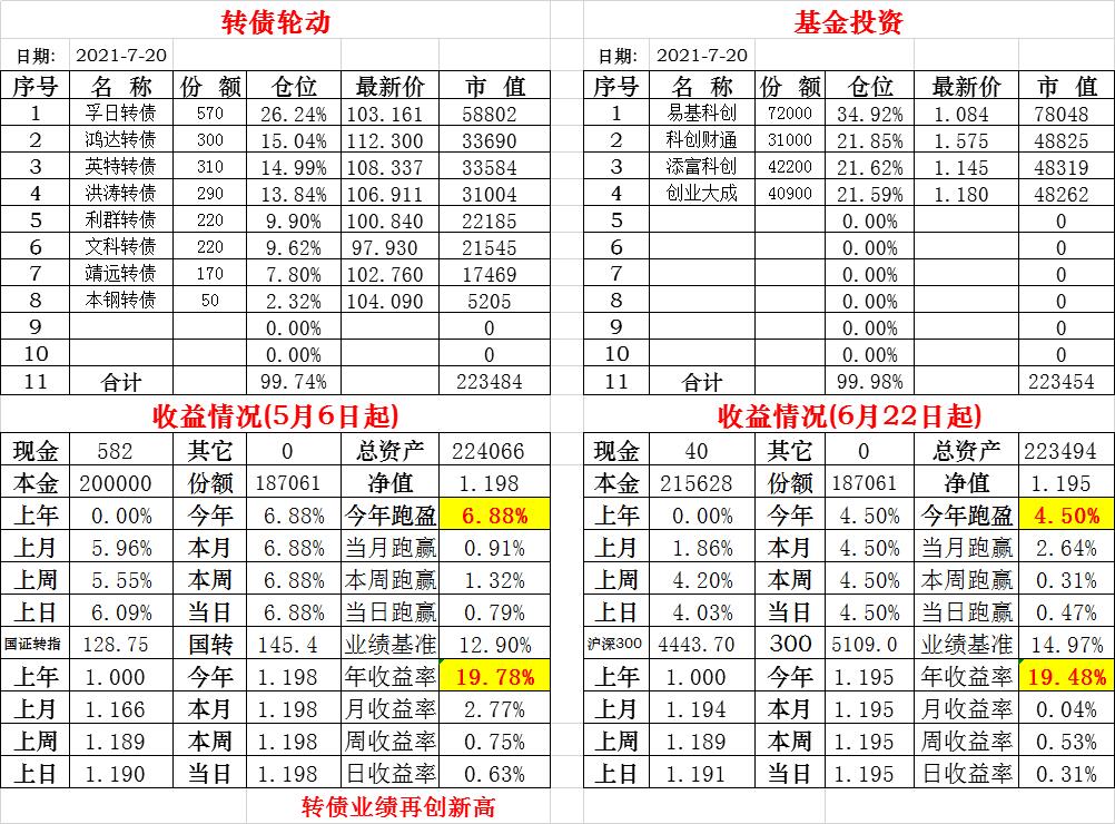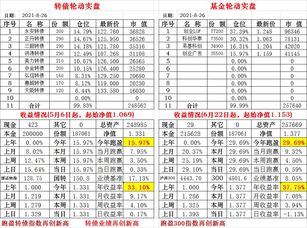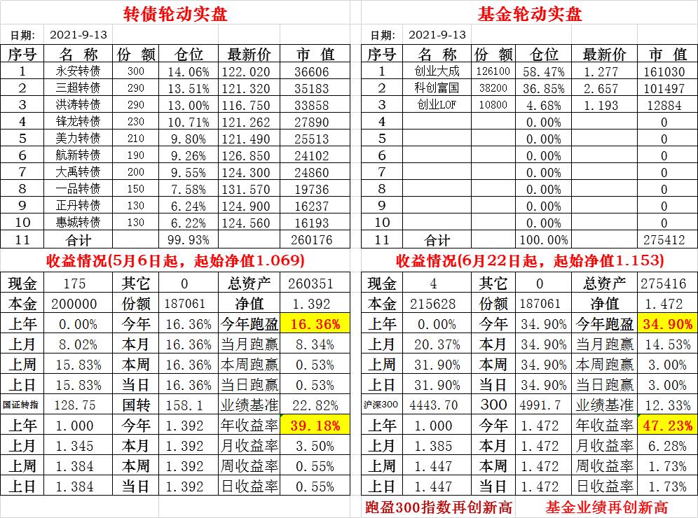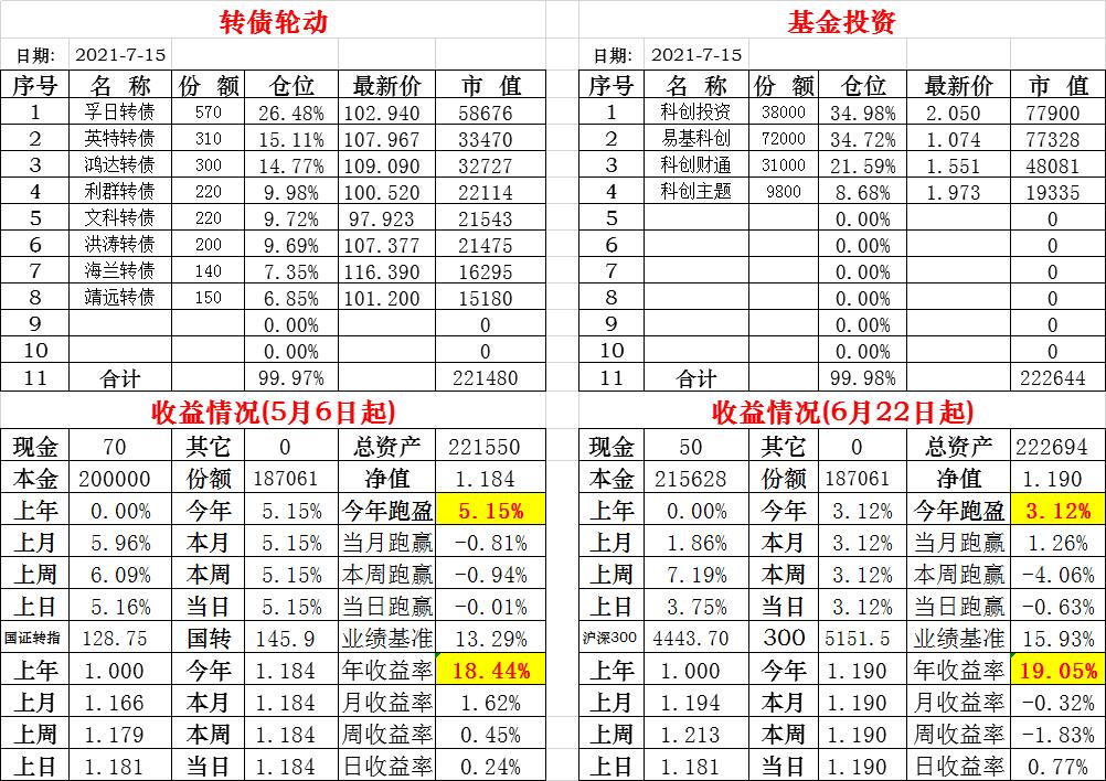 基金初始本金和初始净值:2021年6月22日的转债实盘一致(便于和转债PK)