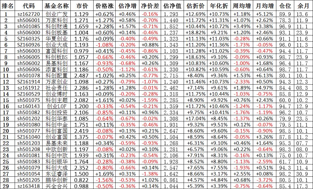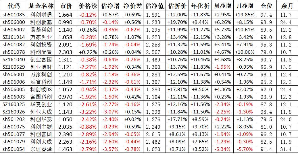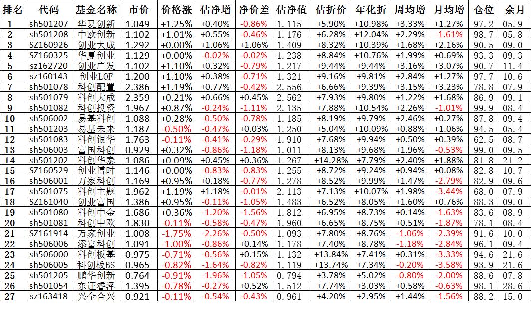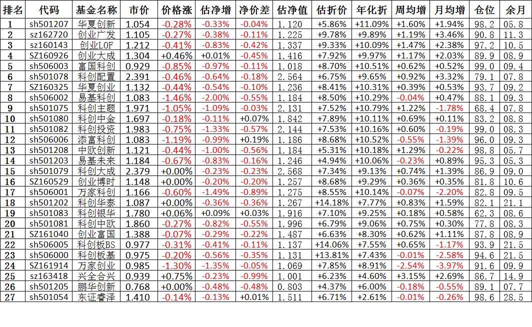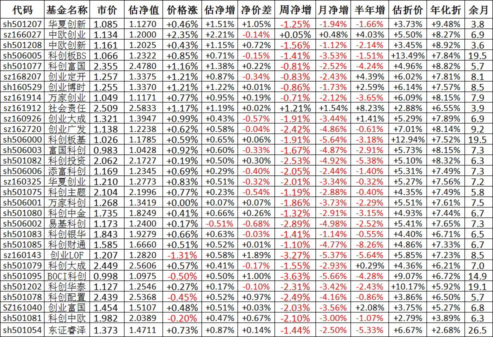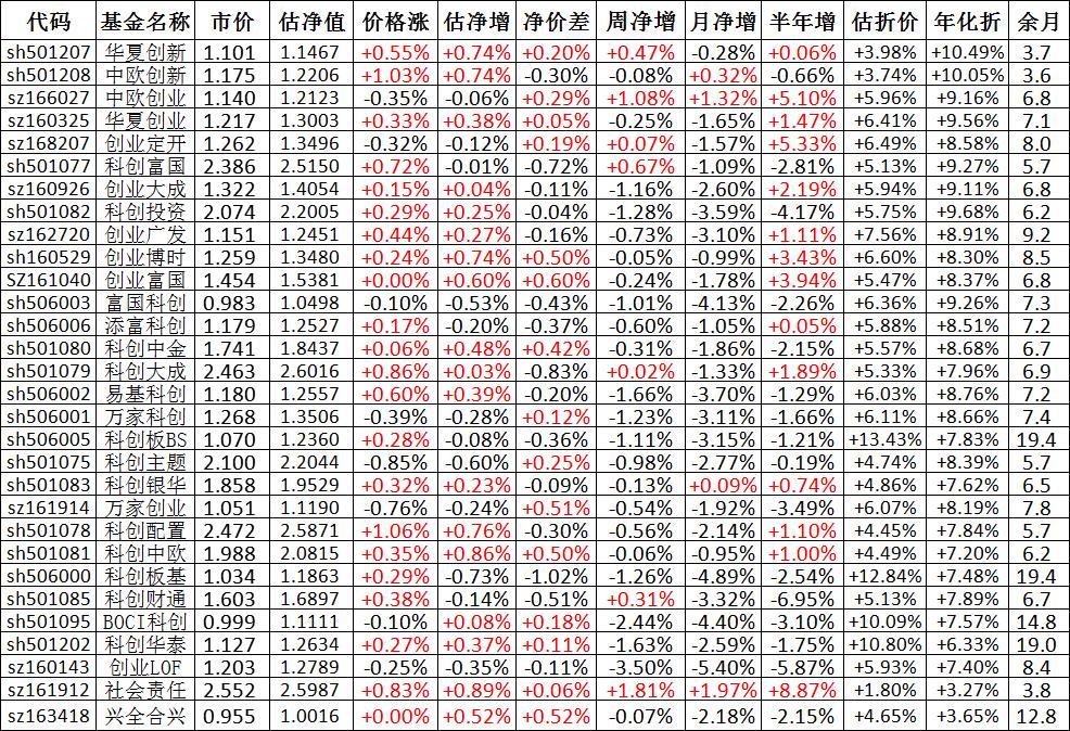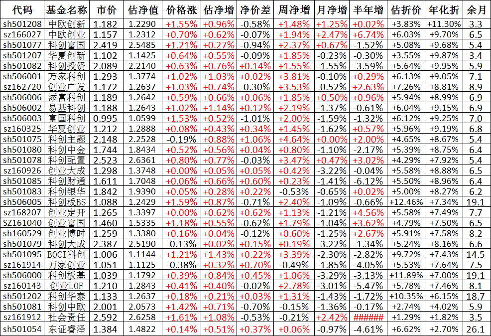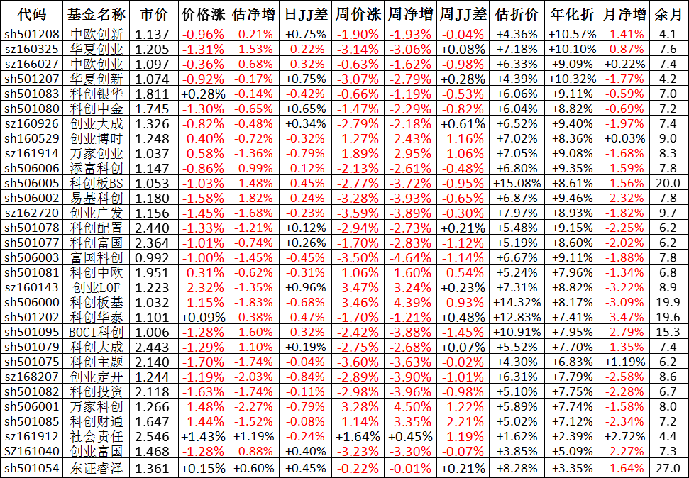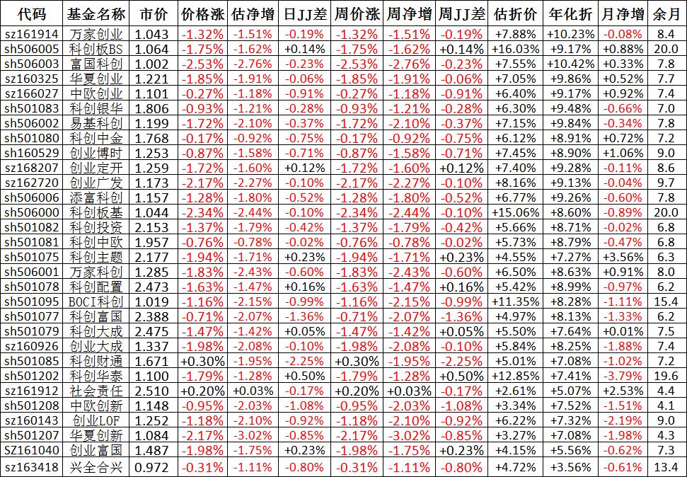 我按照最高折价率(前五)摊大饼搞了100万,目前还亏着呢。最近创业板封基比科创板涨的好。