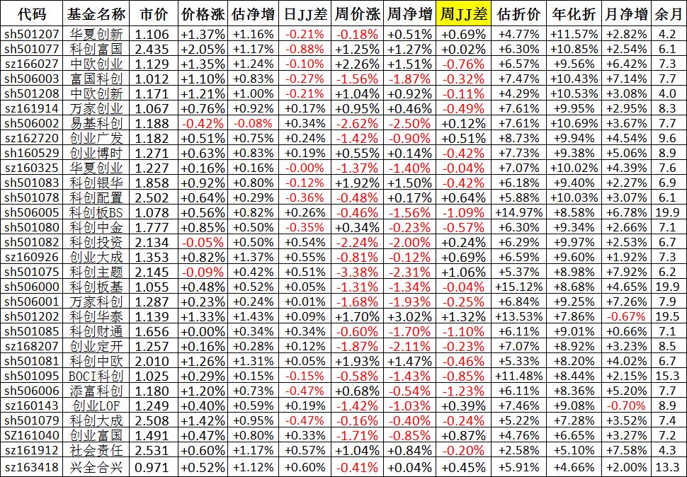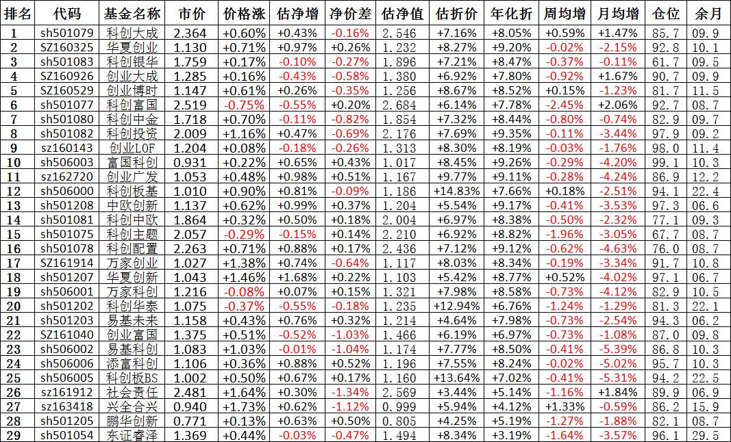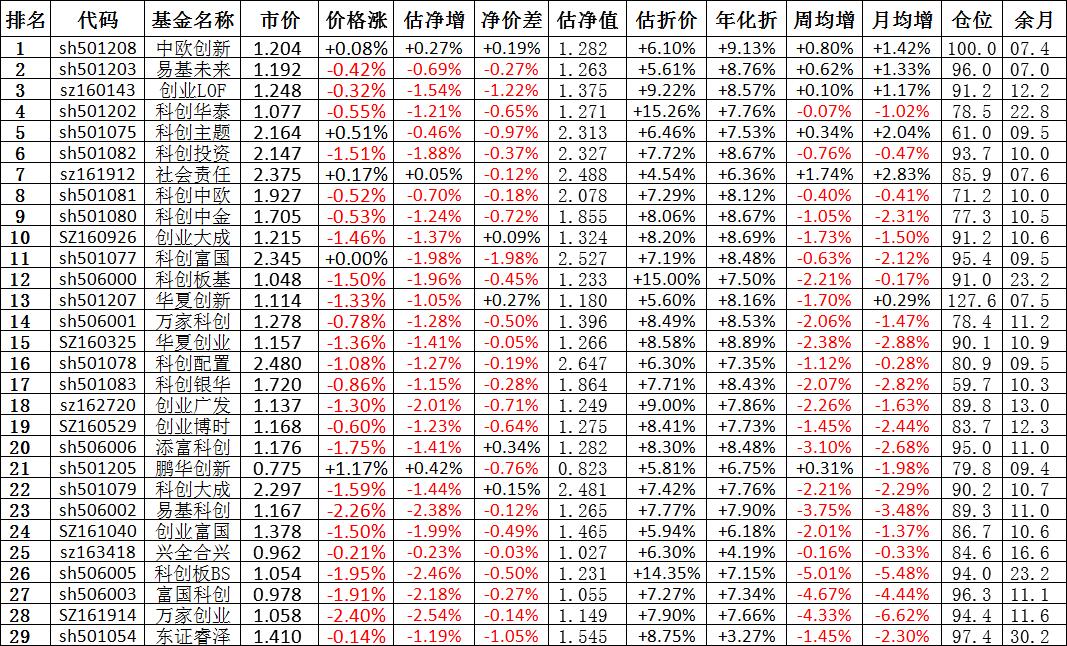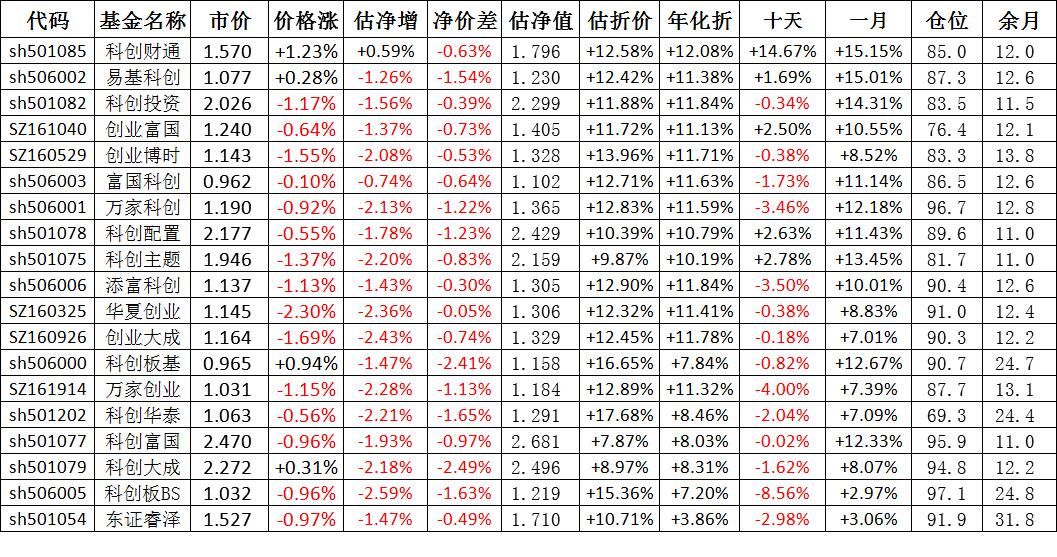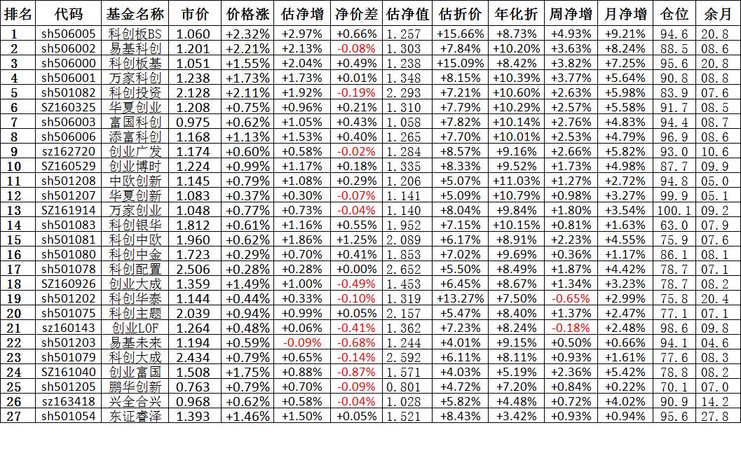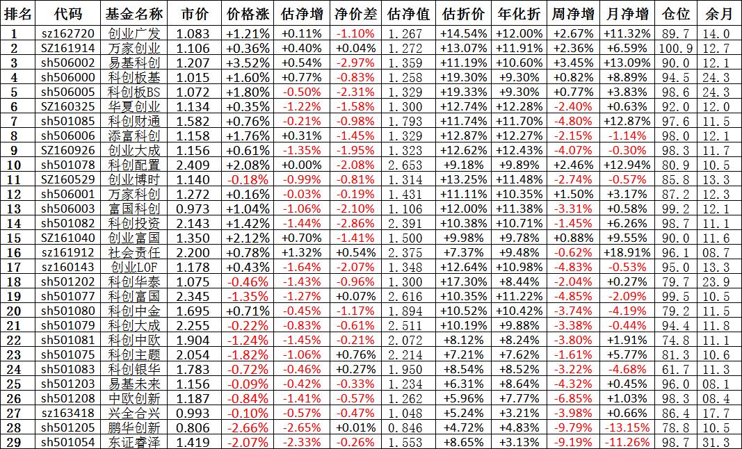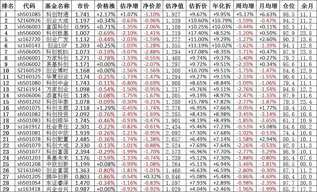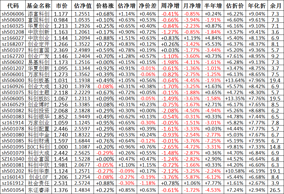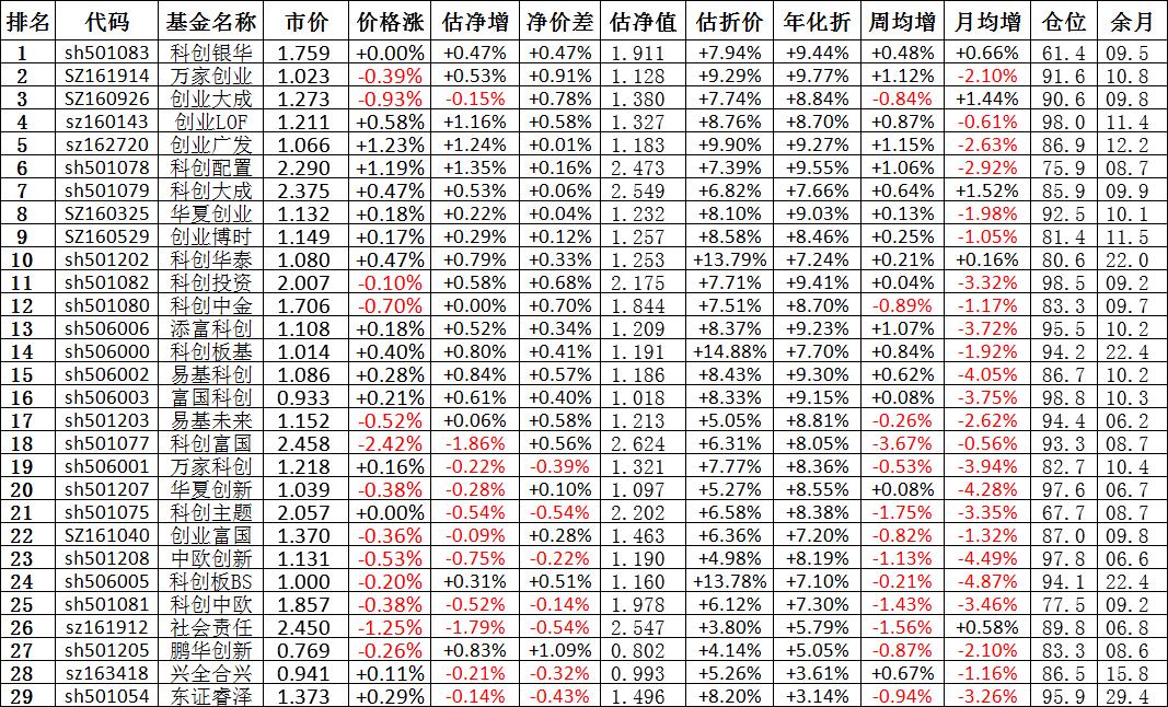 我按照最高折价率(前五)摊大饼搞了100万,目前还亏着呢。最近创业板封基比科创板涨的好。